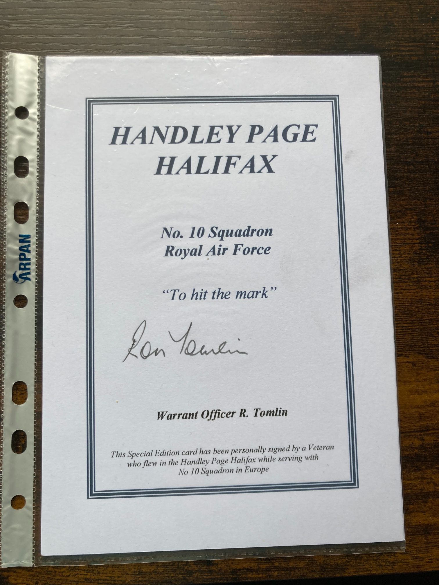 This is a modern commemorative collectors’ card produced for the military memorabilia market, likely dating from the late 20th or early 21st century. The card honours the aviation history of the Handley Page Halifax heavy bomber and the service of No. 10 Squadron of the Royal Air Force. It features the squadron’s motto, To hit the mark. The item is hand-signed in black ink by Warrant Officer R. (Ron) Tomlin, a veteran who served with the unit in Europe during the Second World War. The card is printed on heavy white cardstock with a decorative triple-line border. No. 10 Squadron was a noted heavy bomber unit during the conflict, and such signed ephemera serves as a personal link to the aircrews of Bomber Command. Printed text at the bottom states: This Special Edition card has been personally signed by a Veteran who flew in the Handley Page Halifax while serving with No 10 Squadron in Europe.