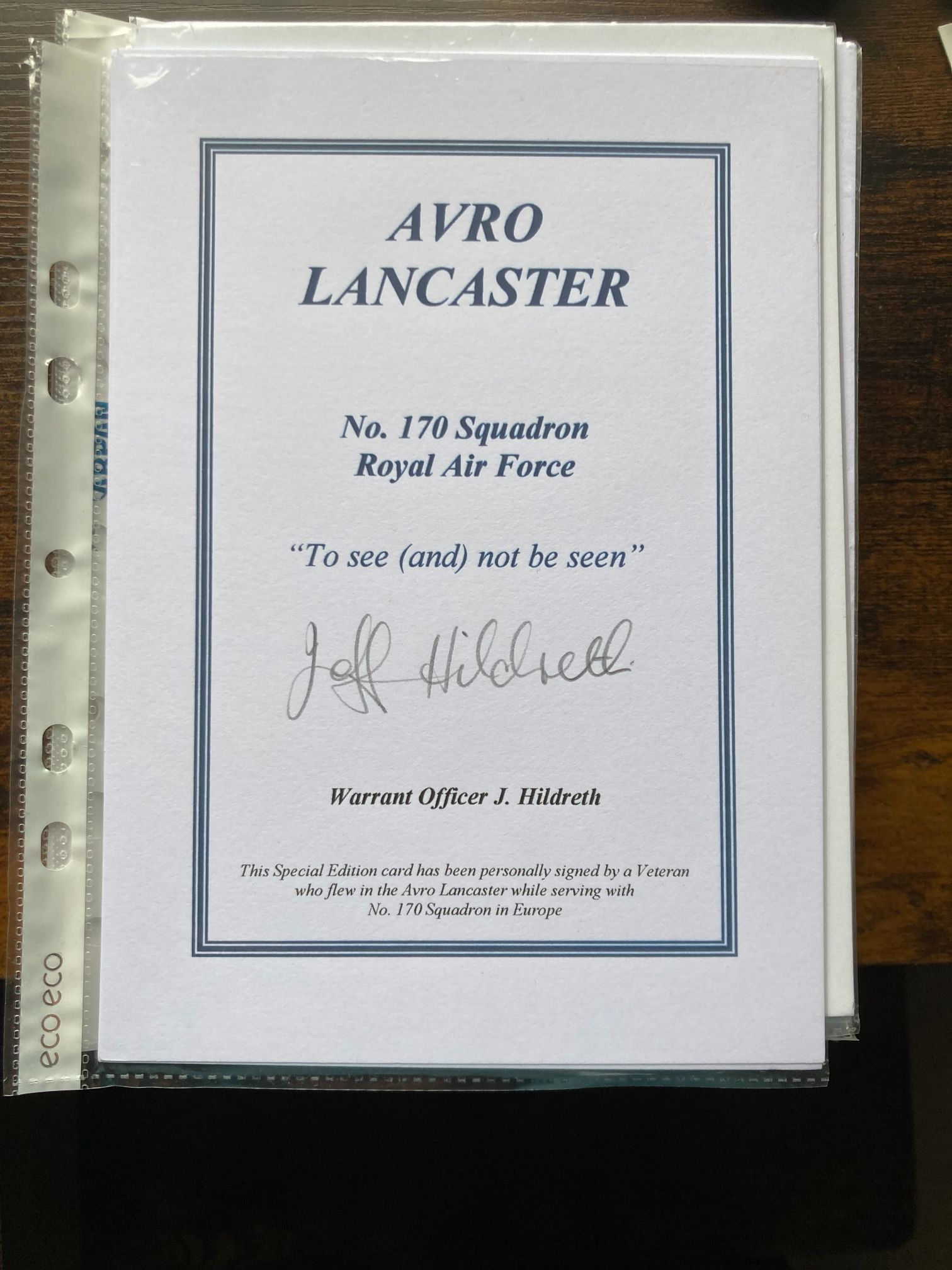 This item is a modern special edition commemorative card produced for the military aviation collectables market, specifically honouring the Avro Lancaster heavy bomber and the personnel of No. 170 Squadron, Royal Air Force. The card is hand-signed in pencil by Warrant Officer Jeff Hildreth, a veteran who served as aircrew on Lancaster bombers with the squadron during the European campaign of the Second World War. No. 170 Squadron was a heavy bomber unit within No. 1 Group of Bomber Command, operating from bases such as RAF Dunholme Lodge and RAF Hemswell between 1944 and 1945. The card features the squadron’s motto, To see (and) not be seen, and includes a printed verification statement regarding the authenticity of the signature. Transcription of text: AVRO LANCASTER, No. 170 Squadron, Royal Air Force, To see (and) not be seen, Jeff Hildreth [Signature], Warrant Officer J. Hildreth, This Special Edition card has been personally signed by a Veteran who flew in the Avro Lancaster while serving with No. 170 Squadron in Europe. Dimensions: 148mm x 210mm.