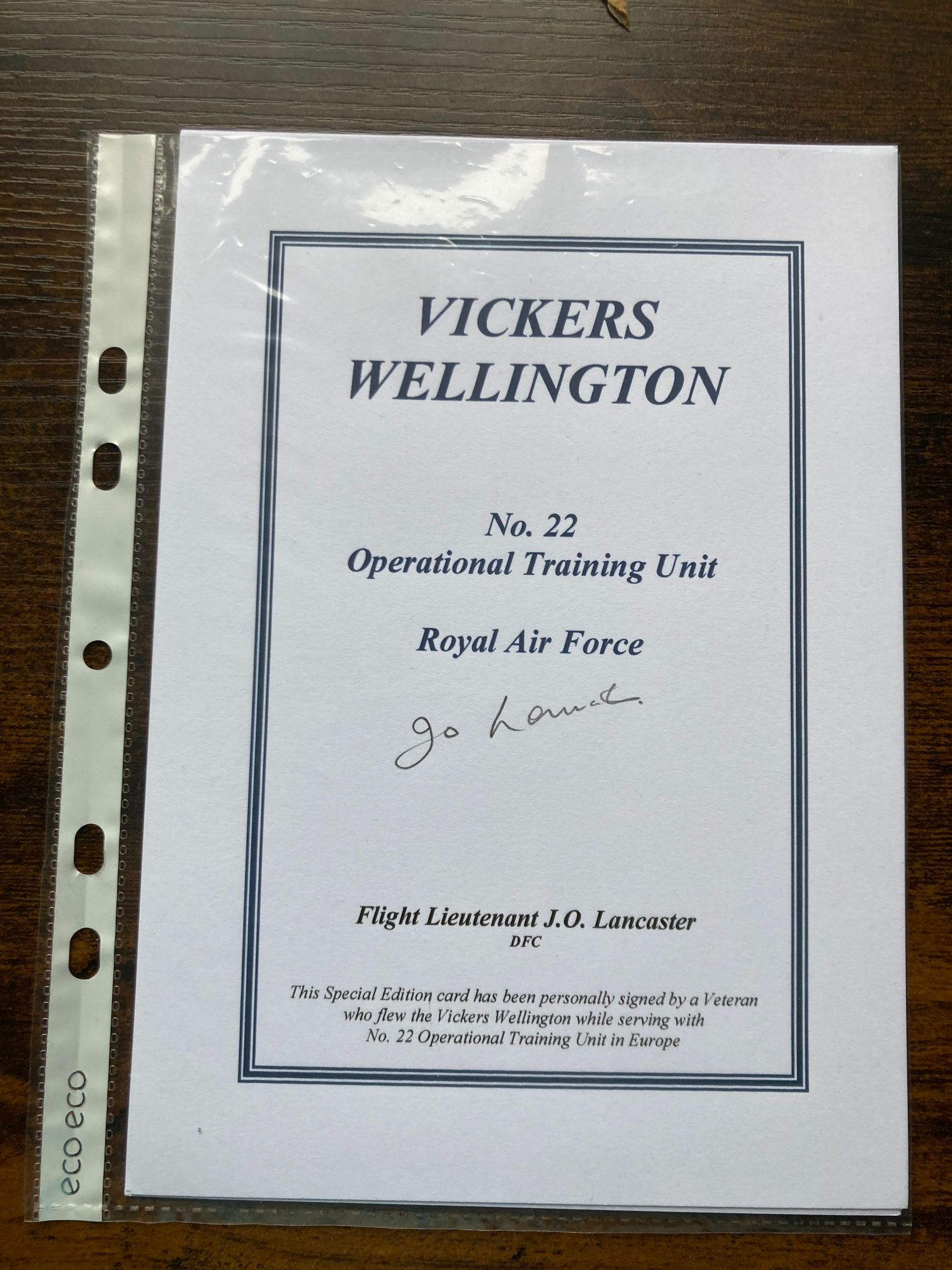 A professionally printed Special Edition commemorative card, produced in the late 20th century to honour the service of the Vickers Wellington bomber and the personnel of No. 22 Operational Training Unit (OTU) of the Royal Air Force. The card features a hand-signed ink signature by Flight Lieutenant J.O. Jeff Lancaster, DFC. Lancaster was a distinguished Second World War veteran who flew Wellingtons during the conflict and later became a renowned test pilot. He is historically significant as the first pilot to successfully use a Martin-Baker ejection seat in an emergency, an event that occurred in 1949 while he was testing an Armstrong Whitworth A.W.52. The card is printed on heavy white stock with a decorative double-line border. Transcribed text includes: VICKERS WELLINGTON, No. 22 Operational Training Unit, Royal Air Force, Flight Lieutenant J.O. Lancaster DFC. A footer notes: This Special Edition card has been personally signed by a Veteran who flew the Vickers Wellington while serving with No. 22 Operational Training Unit in Europe. Dimensions: 210mm x 148mm.
