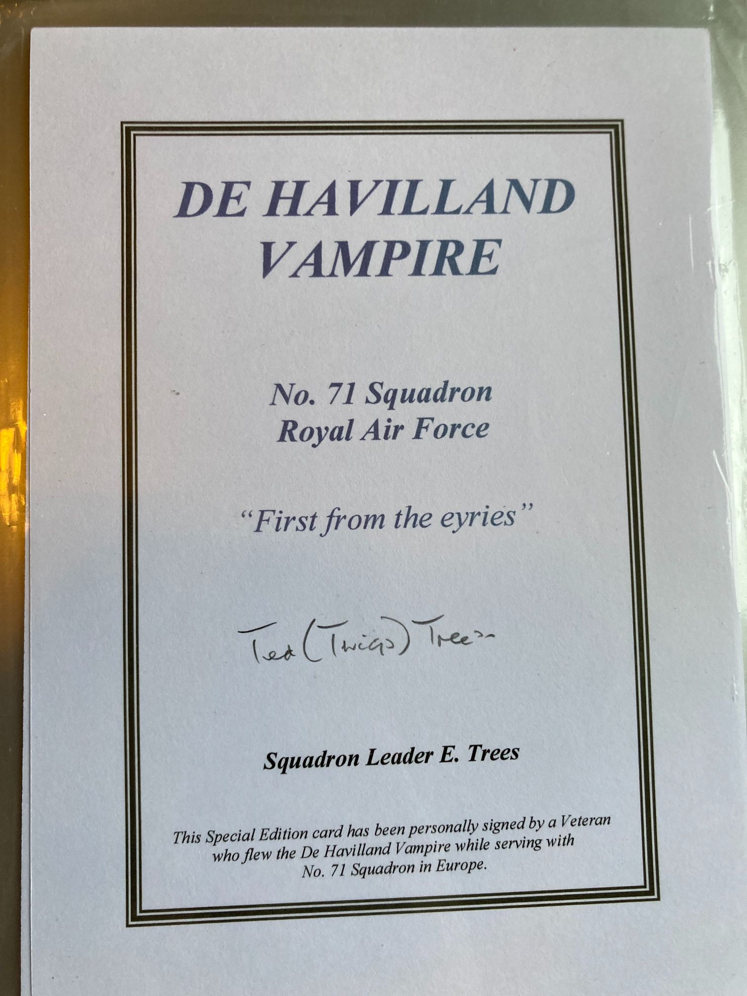 This item is a signed commemorative collectors card, likely produced in the late 20th century as part of a veteran-signed series. The card features the De Havilland Vampire, a pioneering British jet fighter that was the first single-engine jet to enter service with the Royal Air Force. It specifically commemorates No. 71 Squadron, which served as an American volunteer Eagle Squadron during the Second World War before transitioning to jet aircraft like the Vampire in the post-war era while based in Europe. The card is printed on heavy white cardstock with a decorative triple-line border and includes the squadron motto, First from the eyries. It is hand-signed in black ink by Squadron Leader E. Trees, who inscribed his nickname Ted (Twigs) Trees above his printed rank. A footer at the base of the card states: This Special Edition card has been personally signed by a Veteran who flew the De Havilland Vampire while serving with No. 71 Squadron in Europe.