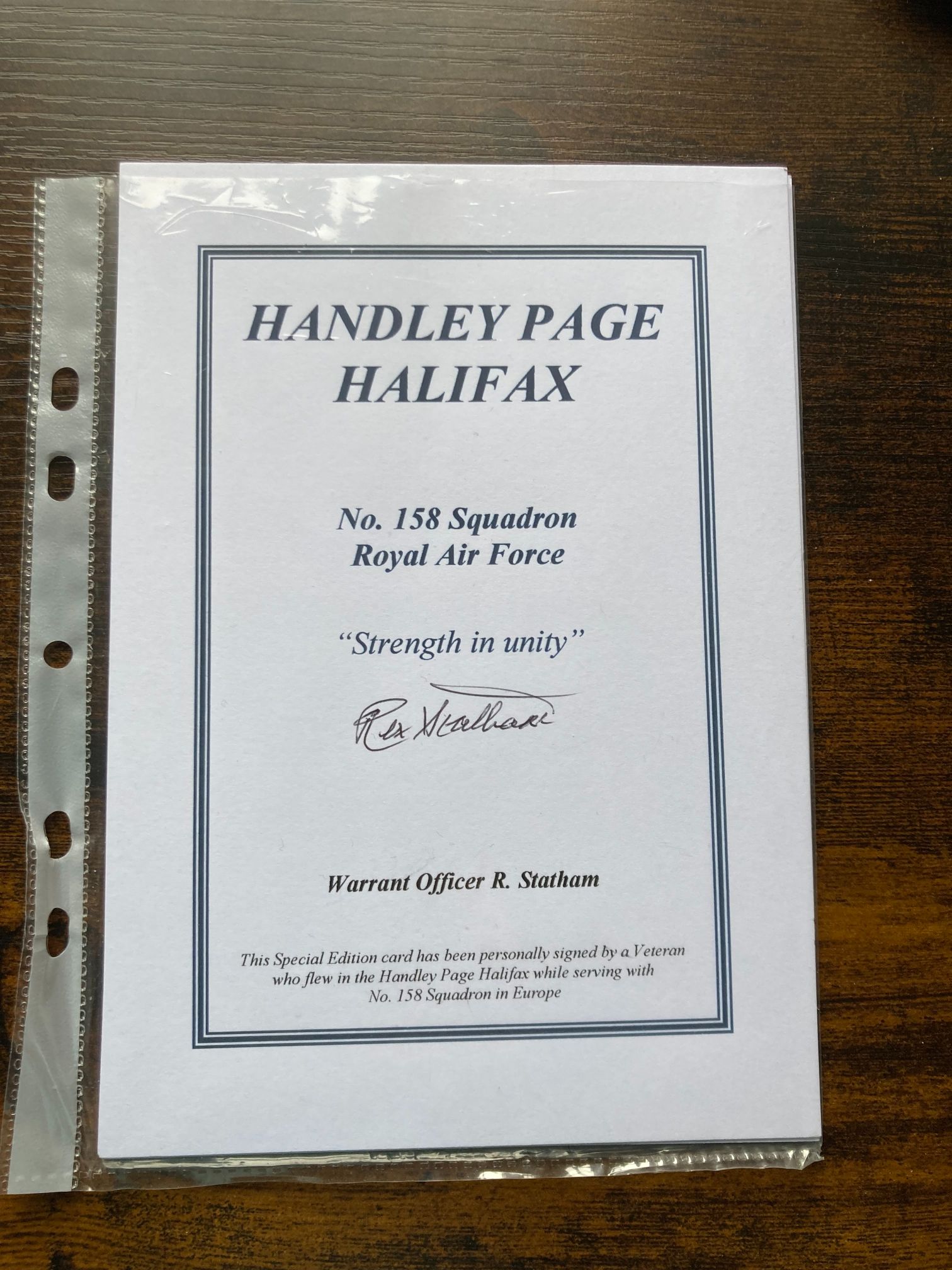 This is a contemporary Special Edition commemorative autograph card dedicated to the Handley Page Halifax, a significant British heavy bomber of the Second World War. The card honours the service of No. 158 Squadron of the Royal Air Force and includes the squadron motto, Strength in unity. It features a clear, original hand-signature in black ink by Warrant Officer Rex Statham. According to the printed text, Statham was a veteran who flew Halifax bombers with No. 158 Squadron during the European campaign. This type of ephemera was typically produced in the late 20th or early 21st century for the collectors market and veteran reunions. Text on the card reads: HANDLEY PAGE HALIFAX, No. 158 Squadron, Royal Air Force, Strength in unity, Rex Statham, Warrant Officer R. Statham, This Special Edition card has been personally signed by a Veteran who flew in the Handley Page Halifax while serving with No. 158 Squadron in Europe.