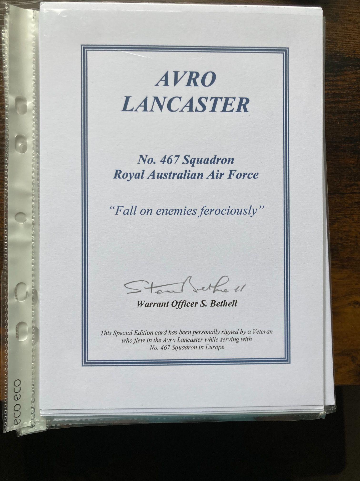 This is a modern special edition commemorative card honouring the Avro Lancaster heavy bomber and the service of No. 467 Squadron, Royal Australian Air Force (RAAF). The card is hand-signed in grey-black ink by Warrant Officer S. Bethell, a veteran who flew the Lancaster with the squadron during the Second World War. No. 467 Squadron was a prominent Australian heavy bomber unit operating under RAF Bomber Command from bases in England, most notably RAF Waddington. The card features the squadron’s official motto, Fall on enemies ferociously, printed in italics. The text at the bottom confirms the authenticity of the signature, stating: This Special Edition card has been personally signed by a Veteran who flew in the Avro Lancaster while serving with No. 467 Squadron in Europe. The card is printed on heavy white cardstock with a decorative blue double-line border. Dimensions: 148mm x 210mm.