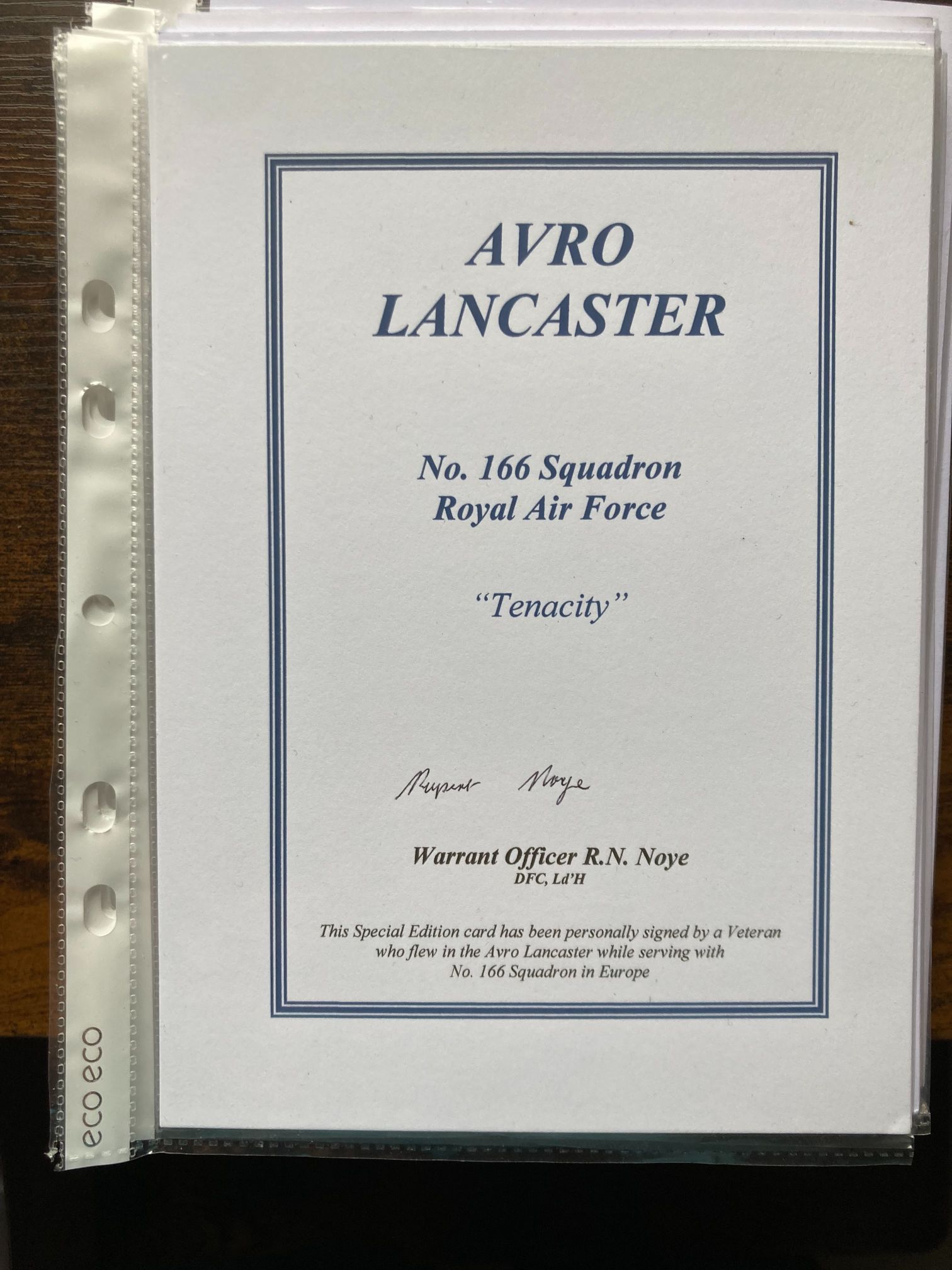 A Special Edition commemorative card for the Royal Air Force, specifically No. 166 Squadron of Bomber Command. The card is dedicated to the Avro Lancaster heavy bomber and features the squadron motto, Tenacity. It is personally hand-signed in black ink by Warrant Officer R.N. Noye, DFC, Ld’H. Warrant Officer Noye served as aircrew during the Second World War, flying operations over occupied Europe from RAF Kirmington in Lincolnshire. His decorations include the Distinguished Flying Cross (DFC), a premier gallantry award for acts of valour and courage whilst flying in active operations against the enemy, and the French Légion d’honneur (Legion of Honour), likely awarded in recognition of his service during the liberation of France. The card serves as a poignant tribute to the crews of Bomber Command and the iconic Lancaster aircraft.