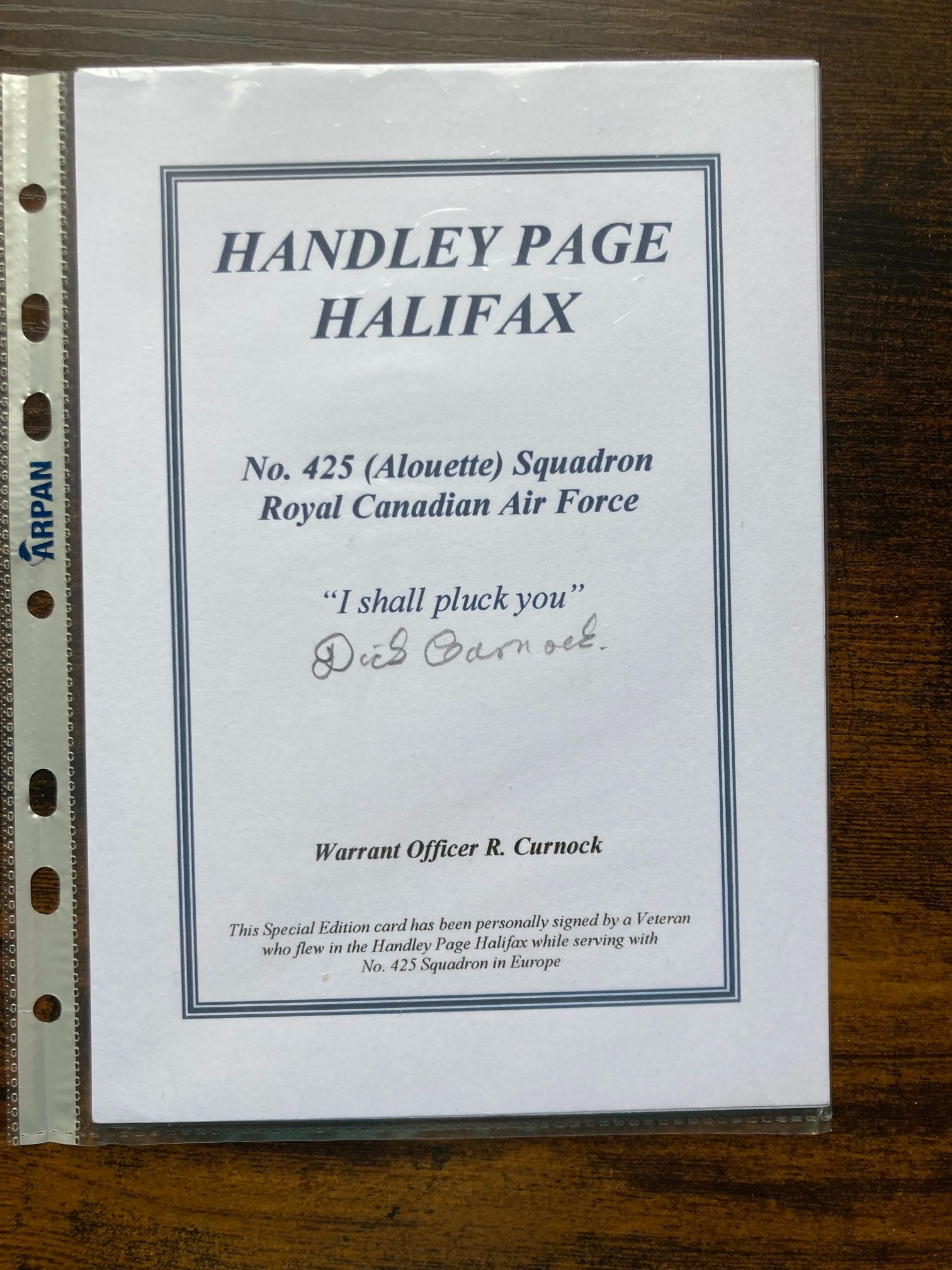This is a modern commemorative Special Edition autographed card celebrating the Handley Page Halifax heavy bomber and the No. 425 (Alouette) Squadron of the Royal Canadian Air Force (RCAF). The card features the squadron motto, I shall pluck you, which is the English translation of the French Je te plumerai. It is hand-signed in ink by Warrant Officer R. (Dick) Curnock, a veteran who flew in the Handley Page Halifax while serving with No. 425 Squadron in Europe during the Second World War. No. 425 Squadron was the first French-Canadian squadron in the RCAF, formed in May 1942. The card is printed on white cardstock with a decorative double-line border. Transcribed text includes: HANDLEY PAGE HALIFAX, No. 425 (Alouette) Squadron Royal Canadian Air Force, I shall pluck you, and Warrant Officer R. Curnock. A footer states: This Special Edition card has been personally signed by a Veteran who flew in the Handley Page Halifax while serving with No. 425 Squadron in Europe. Dimensions: 148mm x 210mm.