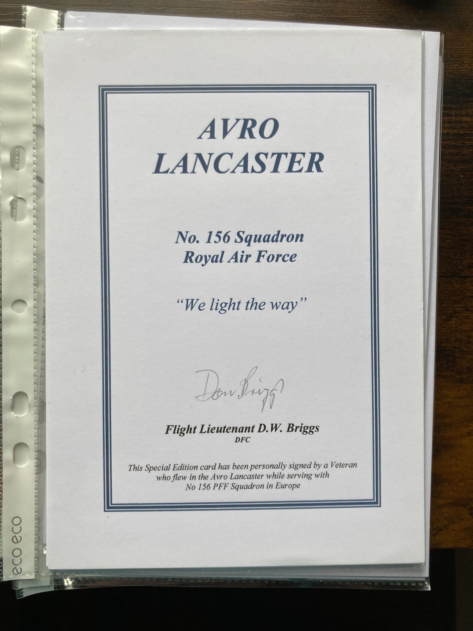 This is a commemorative Special Edition signature card produced in the late 20th or early 21st century to honour the service of the Royal Air Force No. 156 Squadron. The card features the squadron’s motto, We light the way, and commemorates their operations using the Avro Lancaster heavy bomber. As part of the elite Pathfinder Force (PFF), No. 156 Squadron was responsible for the hazardous task of marking targets for the main bomber stream during the European campaign. The card is hand-signed in pencil by Flight Lieutenant D.W. Briggs, DFC, a decorated veteran who served with the unit. Transcription of printed text: AVRO LANCASTER, No. 156 Squadron, Royal Air Force, We light the way, Flight Lieutenant D.W. Briggs DFC. A further note at the bottom confirms the authenticity of the signature by a veteran who flew in the Avro Lancaster while serving with No 156 PFF Squadron in Europe. Dimensions: 148mm x 210mm.
