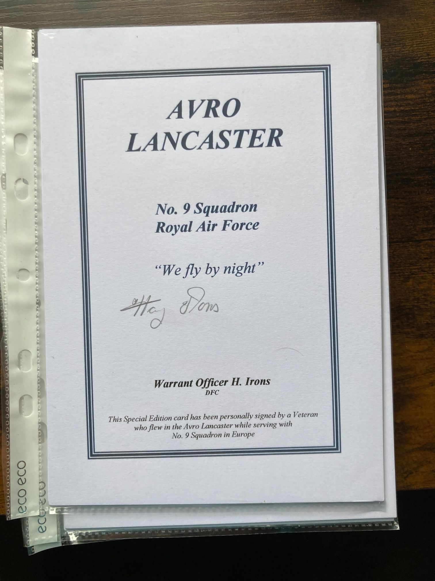 This item is a special edition commemorative card produced to honour the history of the Avro Lancaster bomber and No. 9 Squadron of the Royal Air Force. The card features a hand-signed autograph in pencil by Warrant Officer Harry Irons, DFC. Harry Irons was a highly respected RAF veteran who served as a rear gunner, completing an impressive sixty missions over two tours of operations during the Second World War. No. 9 Squadron is historically significant for its specialised bombing roles, including the successful attack on the German battleship Tirpitz. The card was published in the late 20th or early 21st century as part of a series intended for veteran organisations or historical preservation groups. Transcription: AVRO LANCASTER, No. 9 Squadron, Royal Air Force, We fly by night, Warrant Officer H. Irons DFC, This Special Edition card has been personally signed by a Veteran who flew in the Avro Lancaster while serving with No. 9 Squadron in Europe. Dimensions: 148mm x 210mm.