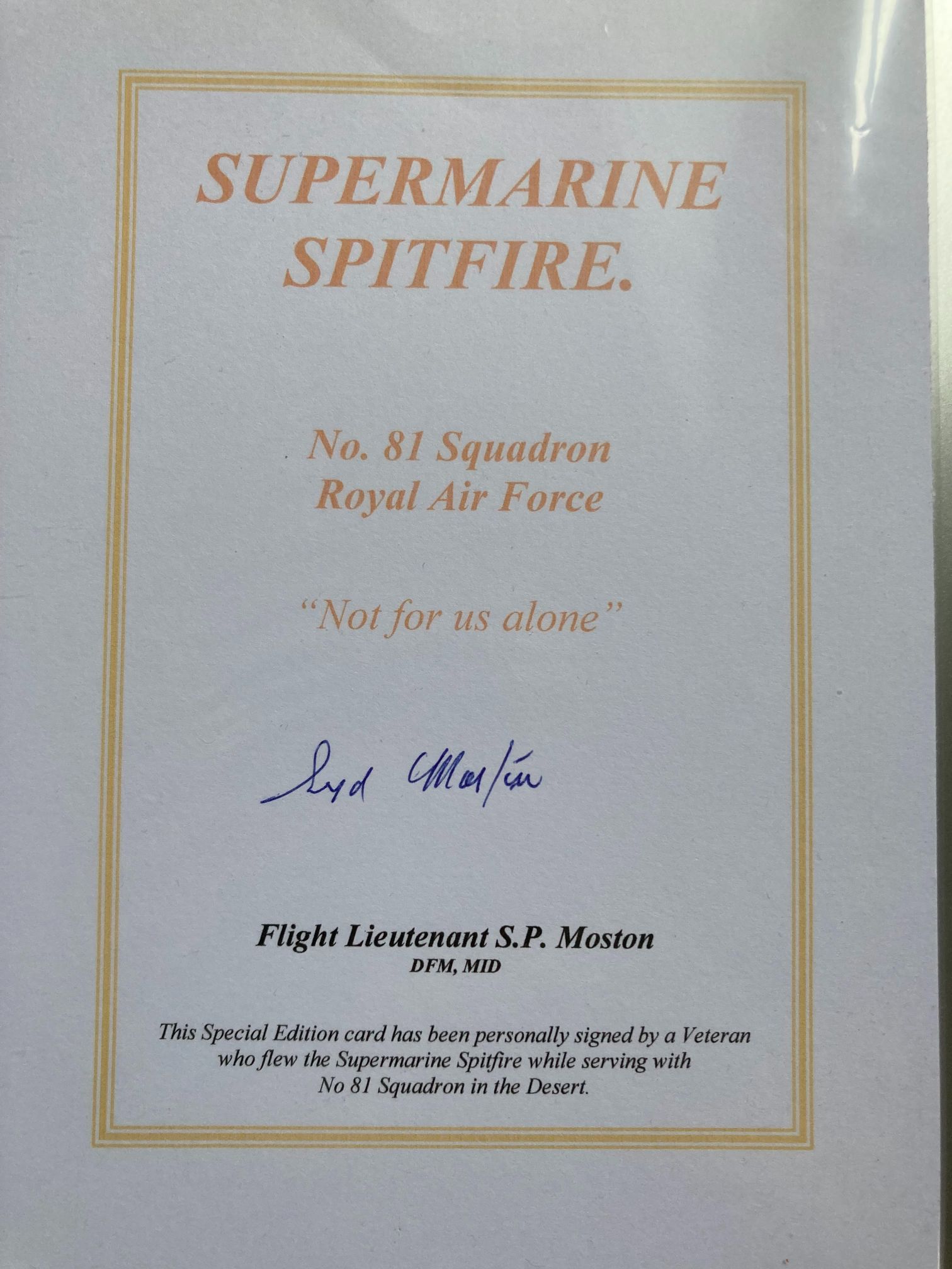 A “Special Edition” commemorative card issued by Matchbox Collectibles as part of their Platinum Edition series, dedicated to the Supermarine Spitfire and No. 81 Squadron, Royal Air Force. The card is hand-signed in blue ink by Flight Lieutenant Sydney Philip Moston, DFM, MiD. Moston was a distinguished veteran who flew Spitfires with No. 81 Squadron during the North African Desert campaign. His post-nominal letters signify high gallantry: the Distinguished Flying Medal (DFM), awarded to non-commissioned officers for acts of valour while flying in active operations, and a Mention in Despatches (MiD). No. 81 Squadron had a notable record in the Mediterranean theatre, transitioning to Spitfires in late 1942 to support the Allied advance. The card features the squadron motto “Not for us alone” (Non Nobis Solum) and provides biographical context regarding Moston’s service.