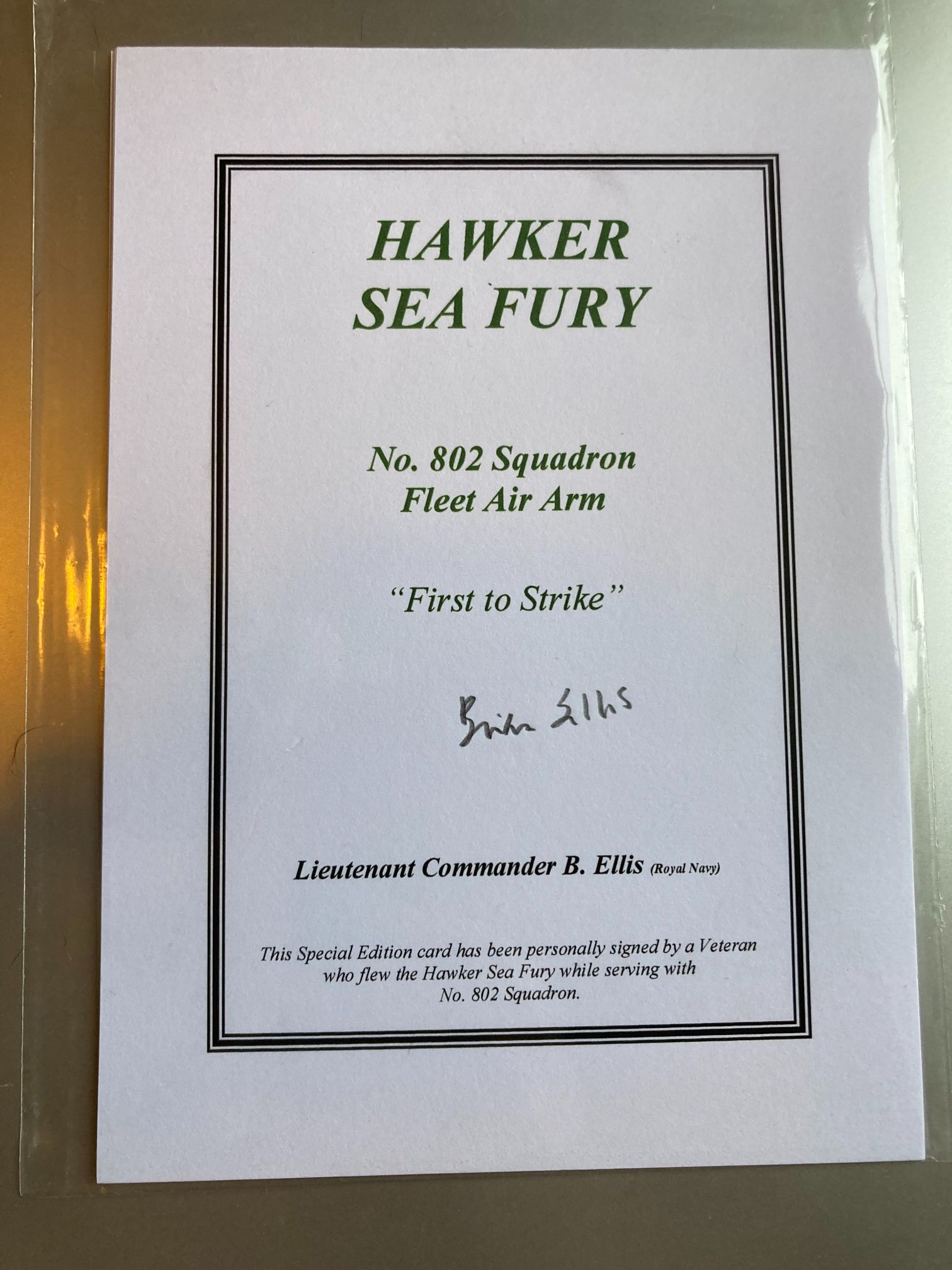 This item is a special edition commemorative card hand-signed by Lieutenant Commander Brian Ellis, Royal Navy. The card is dedicated to the Hawker Sea Fury and No. 802 Squadron, Fleet Air Arm, and features the squadron motto First to Strike. Lieutenant Commander Ellis was a noted pilot with 802 Naval Air Squadron during the Korean War. While operating from the Colossus-class light fleet carrier HMS Ocean, the squadron gained fame for its actions on 9 August 1952. During this engagement, Sea Furies successfully downed a North Korean MiG-15 jet fighter, marking one of the few instances where a piston-engined aircraft defeated a jet-powered opponent in combat. The card is printed on high-quality white card stock with green ink for the primary headings and a double-line black border. It includes a printed attribution to the signatory and a footer confirming the authenticity of the veteran’s signature.