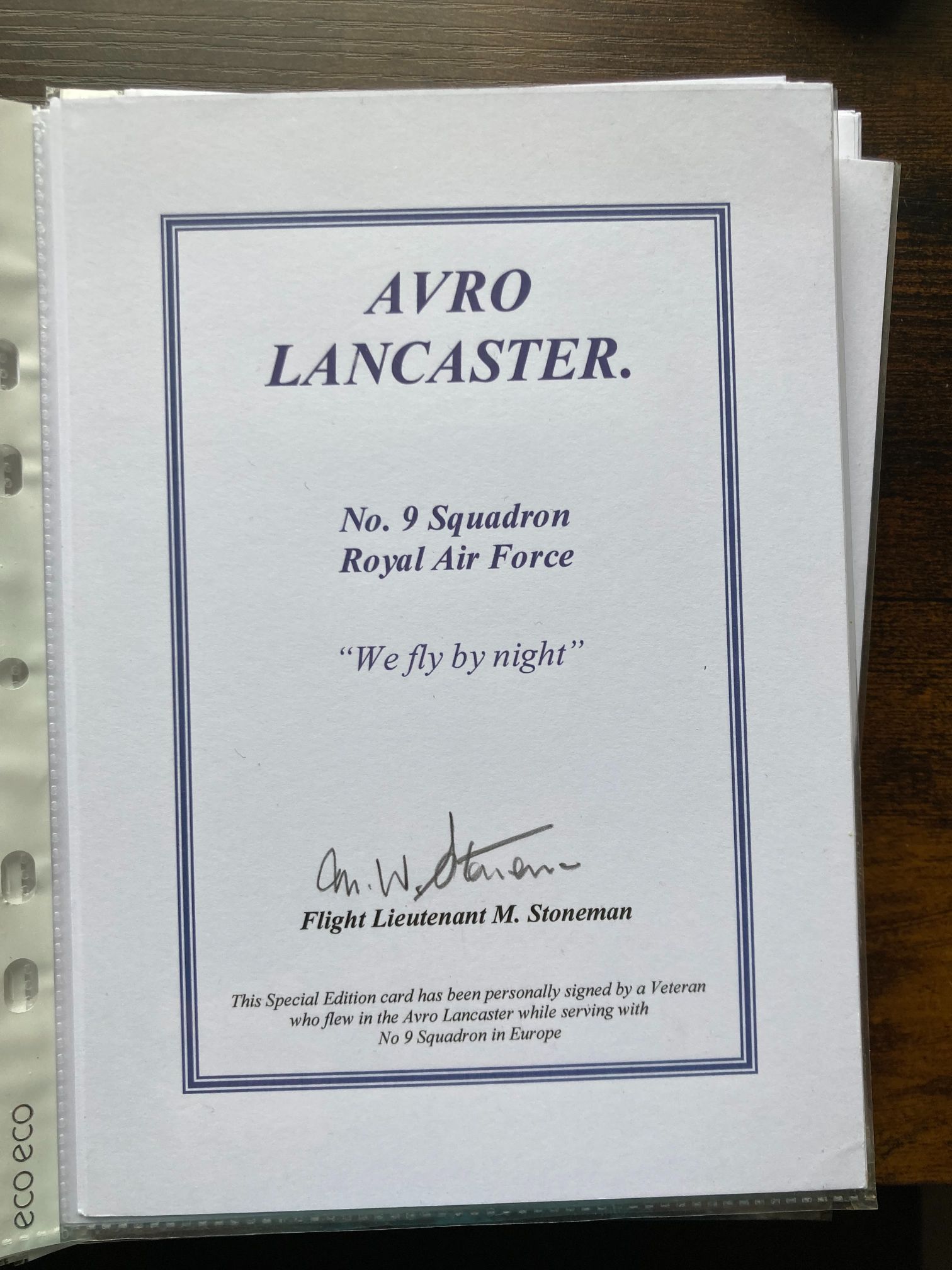 A Special Edition commemorative ephemera card dedicated to the Avro Lancaster bomber and the Royal Air Force No. 9 Squadron. The card is printed on heavy white stock and features a blue double-line border. It is hand-signed in black ink by Flight Lieutenant M. Stoneman, a veteran of the squadron. No. 9 Squadron is historically significant for its specialist heavy bombing operations during the Second World War, including the sinking of the German battleship Tirpitz. The card includes the squadron motto, We fly by night, and a printed explanatory note stating: This Special Edition card has been personally signed by a Veteran who flew in the Avro Lancaster while serving with No 9 Squadron in Europe. This type of commemorative card was typically produced for veteran reunions or charitable RAF associations in the late 20th or early 21st century to honour the service of Bomber Command aircrews. Dimensions: Approximately 148mm x 210mm (A5).