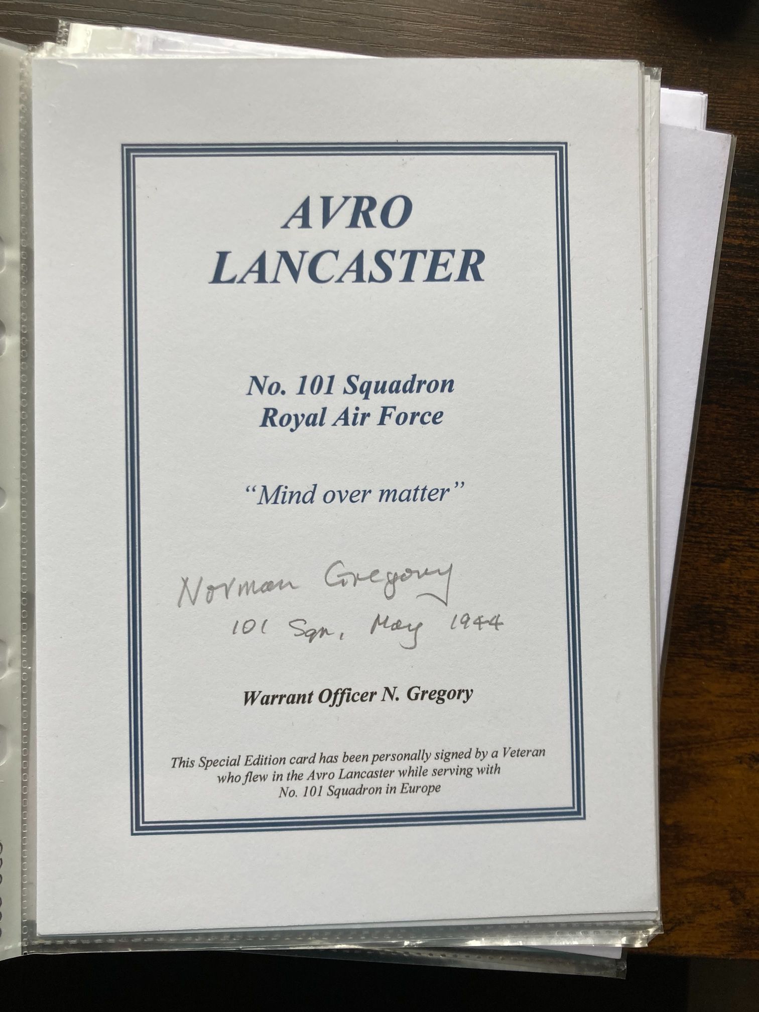 Royal Air Force interest. A special edition commemorative card for the Avro Lancaster heavy bomber, hand-signed by Warrant Officer Norman Gregory. The card features printed text for No. 101 Squadron, Royal Air Force, along with the English translation of the squadron motto, Mind over matter (Mens Agitat Molem). The veteran has signed the card in pencil and included the handwritten inscription: 101 Sqn. May 1944. No. 101 Squadron was a specialist unit within RAF Bomber Command. From late 1943, their Lancasters were equipped with Airborne Cigar (ABC) radio-jamming equipment intended to disrupt German night-fighter communications. These aircraft carried an additional eighth crew member to operate the equipment. Because these Lancasters had to remain on air throughout the mission to jam signals, they were easily tracked by German ground stations and night fighters, leading to the squadron suffering the highest casualty rates of any Lancaster squadron in Bomber Command.