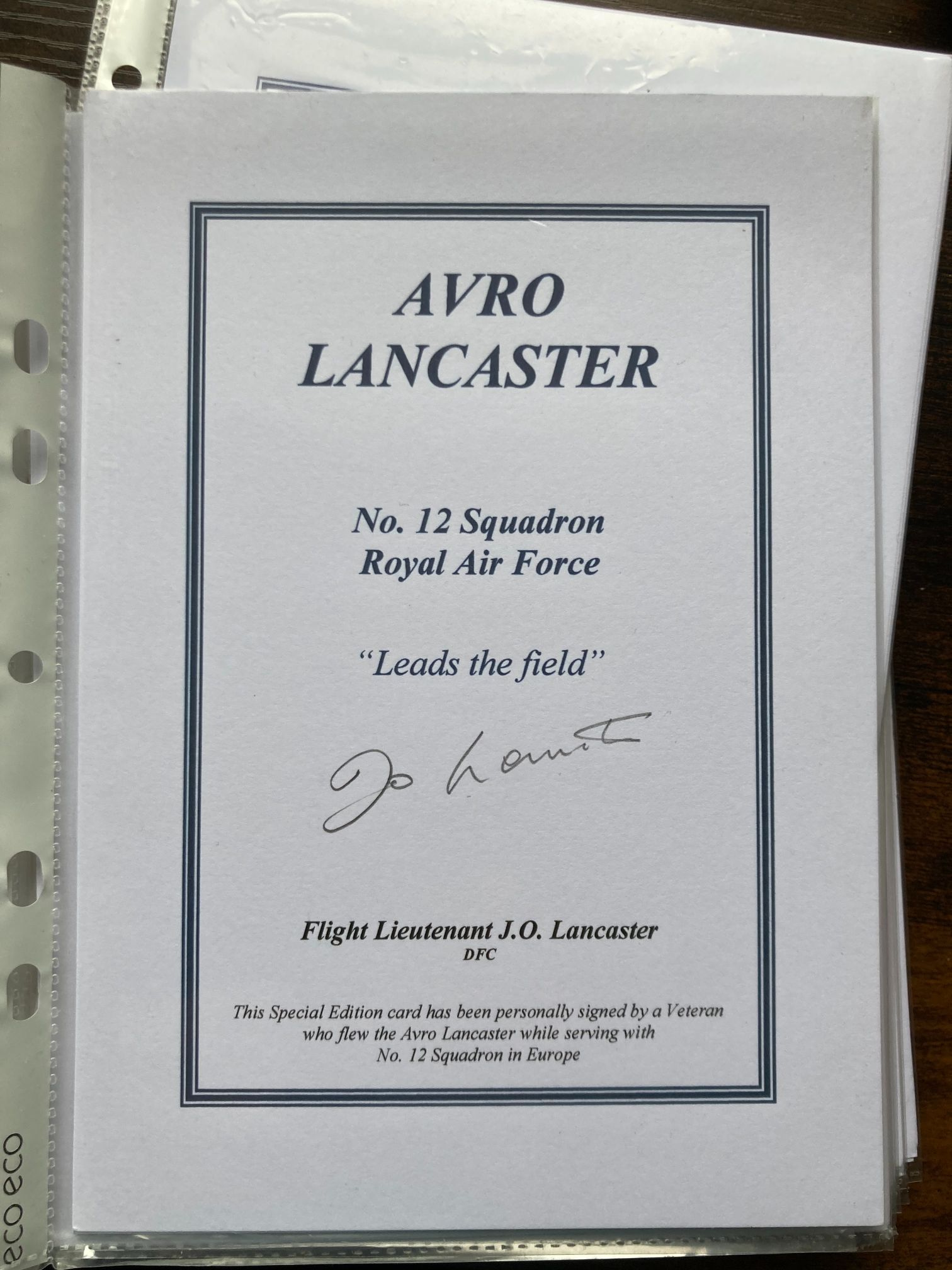 This is a modern Special Edition commemorative card produced for the aviation and military memorabilia market, specifically honouring the service of No. 12 Squadron, Royal Air Force, during the Second World War. The card is printed on high-quality white cardstock with a blue double-line border and features printed text identifying the squadron and its official motto, Leads the field. The piece is centrally hand-signed in ink by Flight Lieutenant J.O. Lancaster, DFC, a distinguished RAF veteran who served as a pilot with No. 12 Squadron flying Avro Lancaster heavy bombers within the European Theatre of Operations. J.O. Lancaster is a notable figure in aviation history, later becoming a test pilot and the first person to use an emergency ejection seat in a jet aircraft. This item serves as a significant piece of biographical ephemera relating to Bomber Command. Dimensions: Approximately 150mm x 210mm.