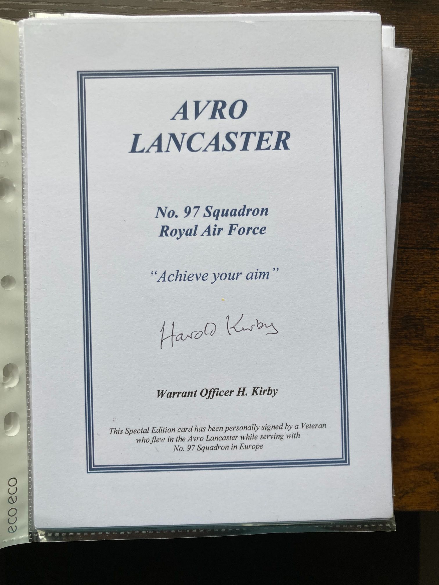 A modern Special Edition commemorative card dedicated to the Avro Lancaster heavy bomber and the service of No. 97 Squadron, Royal Air Force. The card features the squadron motto, Achieve your aim, and is hand-signed in black ink by veteran Warrant Officer Harold Kirby, who served with the squadron in Europe during the Second World War. No. 97 (Straits Settlements) Squadron was a distinguished unit within Bomber Command, notably serving as part of the Pathfinder Force. The card is printed on high-quality white textured cardstock with a decorative blue double-line border. Transcribed text includes: AVRO LANCASTER, No. 97 Squadron Royal Air Force, Achieve your aim, and Warrant Officer H. Kirby. The bottom text confirms the signature is from a veteran who flew in the Lancaster while serving with the squadron. Dimensions: 148mm x 210mm.