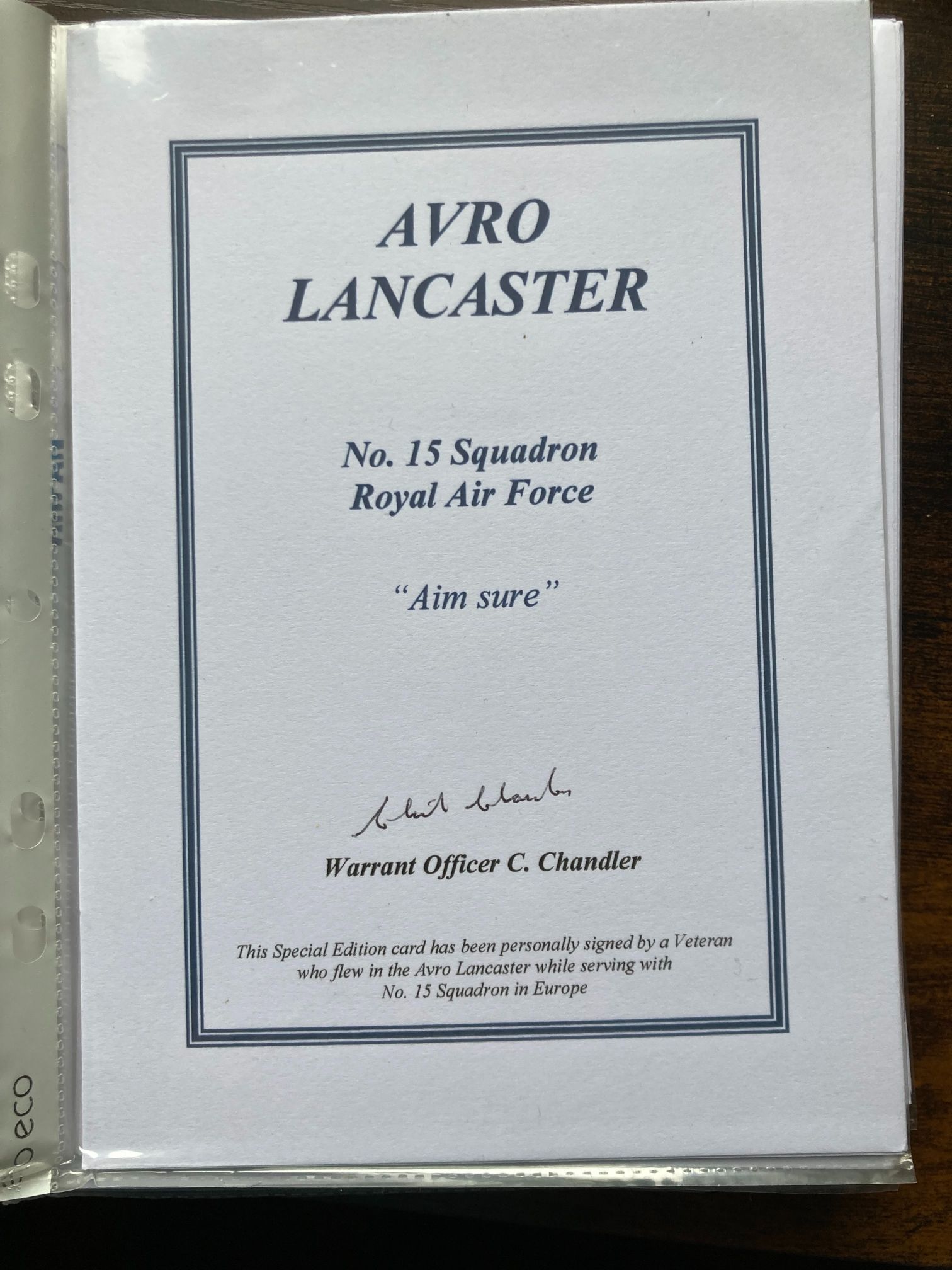 This is a commemorative Special Edition card dedicated to the Avro Lancaster heavy bomber and its service with No. 15 Squadron of the Royal Air Force. The card features a hand-signed autograph in black ink by Warrant Officer C. Chandler, a veteran airman who served with the squadron in Europe during the Second World War. The Avro Lancaster was the pre-eminent heavy bomber used by the RAF’s Bomber Command, and No. 15 Squadron was a distinguished unit that transitioned to Lancasters in 1943, participating in numerous major offensives. The card includes the squadron’s official motto, Aim sure. This item is a modern commemorative issue, likely produced in the late 20th or early 21st century for collectors of aviation history and RAF ephemera. Text on the card reads: AVRO LANCASTER, No. 15 Squadron Royal Air Force, Aim sure, Warrant Officer C. Chandler, This Special Edition card has been personally signed by a Veteran who flew in the Avro Lancaster while serving with No. 15 Squadron in Europe. Dimensions: 150mm x 105mm approx.
