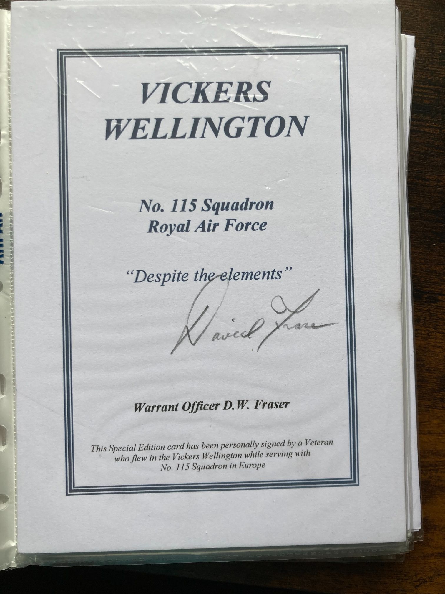 This is a Special Edition commemorative card dedicated to the Vickers Wellington bomber and No. 115 Squadron of the Royal Air Force. The card features the squadron’s motto, Despite the elements. It is hand-signed in pencil by Warrant Officer D.W. Fraser, a veteran who served with the squadron in Europe during the Second World War. No. 115 Squadron was a significant heavy bomber squadron, being the first to fly the Wellington in combat and later transitioning to Lancasters. These cards were often produced for collectors or as part of limited edition aviation art sets in the late 20th and early 21st centuries. Transcription: VICKERS WELLINGTON / No. 115 Squadron / Royal Air Force / Despite the elements / Warrant Officer D.W. Fraser / This Special Edition card has been personally signed by a Veteran who flew in the Vickers Wellington while serving with No. 115 Squadron in Europe. Dimensions: 152mm x 102mm.