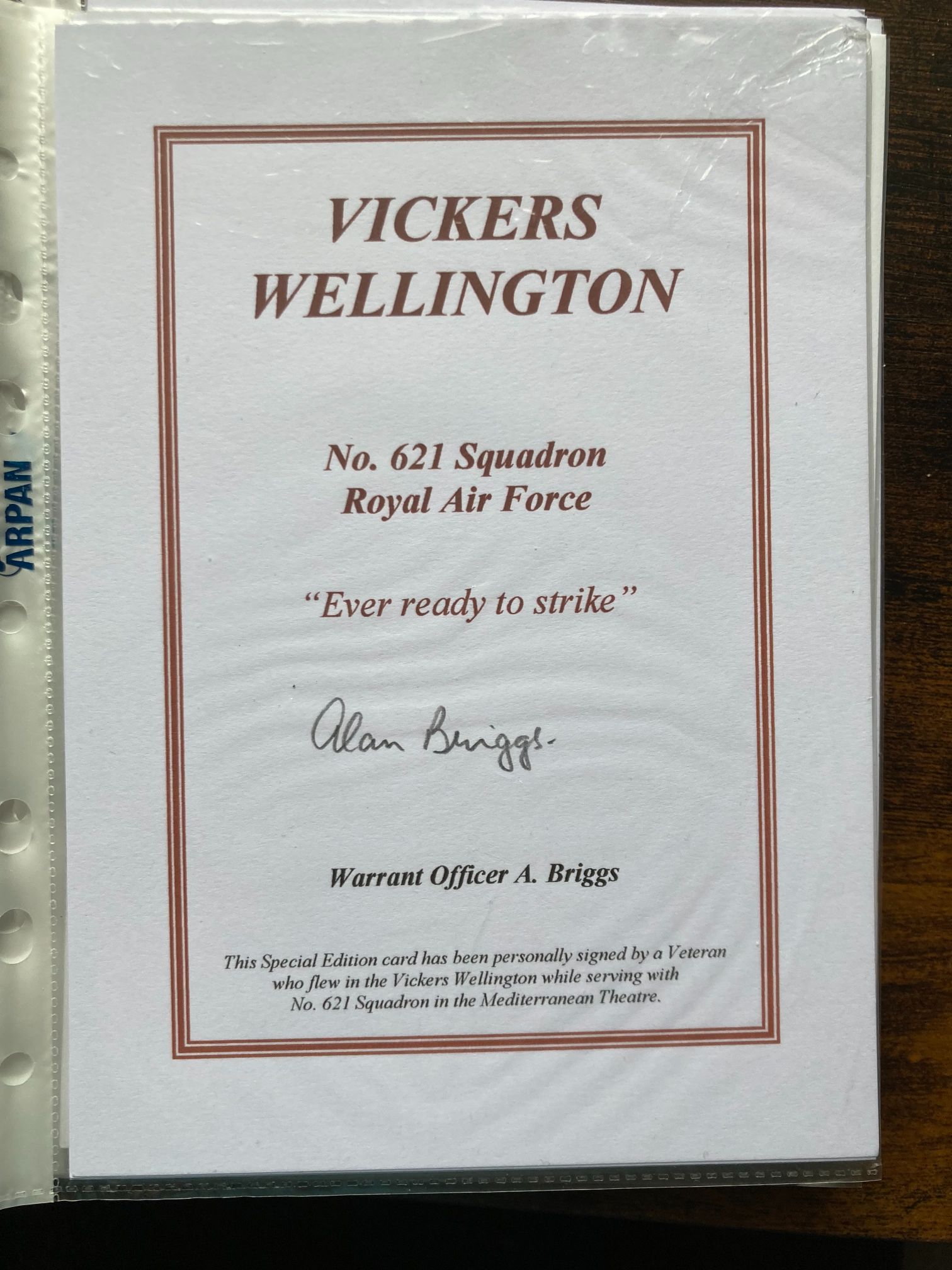 A professionally printed “Special Edition” commemorative card personally autographed by Warrant Officer Alan Briggs of the Royal Air Force. The card is dedicated to the Vickers Wellington aircraft and specifically identifies Briggs’ service with No. 621 Squadron, featuring the official squadron motto “Ever ready to strike.” During the Second World War, No. 621 Squadron operated extensively within the Mediterranean Theatre, primarily tasked with maritime reconnaissance and anti-submarine patrols to protect Allied shipping. The Vickers Wellington, affectionately known as the “Wimpy,” was a cornerstone of these operations due to its robust geodetic construction. This item serves as a poignant link to the Mediterranean air war and the specialised role of RAF maritime operations in that theatre.