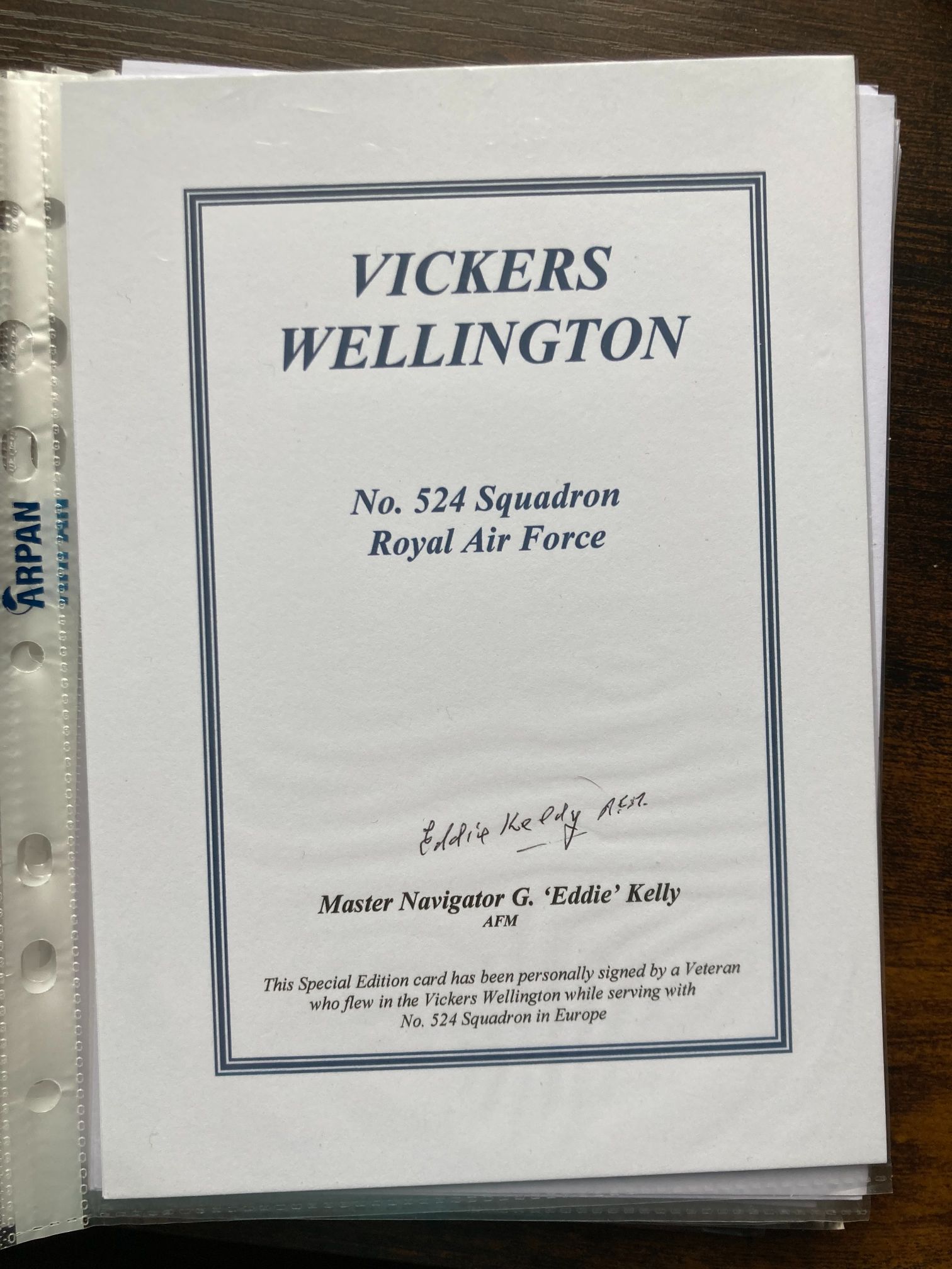 This is a commemorative Special Edition collector card, likely produced as part of a limited series in the late 20th or early 21st century to honour the service of the Vickers Wellington aircraft and the personnel of No. 524 Squadron, Royal Air Force. The card features the original hand-signed signature of Master Navigator G. Eddie Kelly, AFM, in black ink above his printed name. No. 524 Squadron was a maritime unit that operated Wellingtons on anti-shipping and coastal duties during the European theatre of the Second World War. The card includes the printed text: VICKERS WELLINGTON, No. 524 Squadron Royal Air Force, and a statement confirming the veteran’s service in Europe. The item is presented on white cardstock with a blue double-border frame. Dimensions: 148mm x 210mm.
