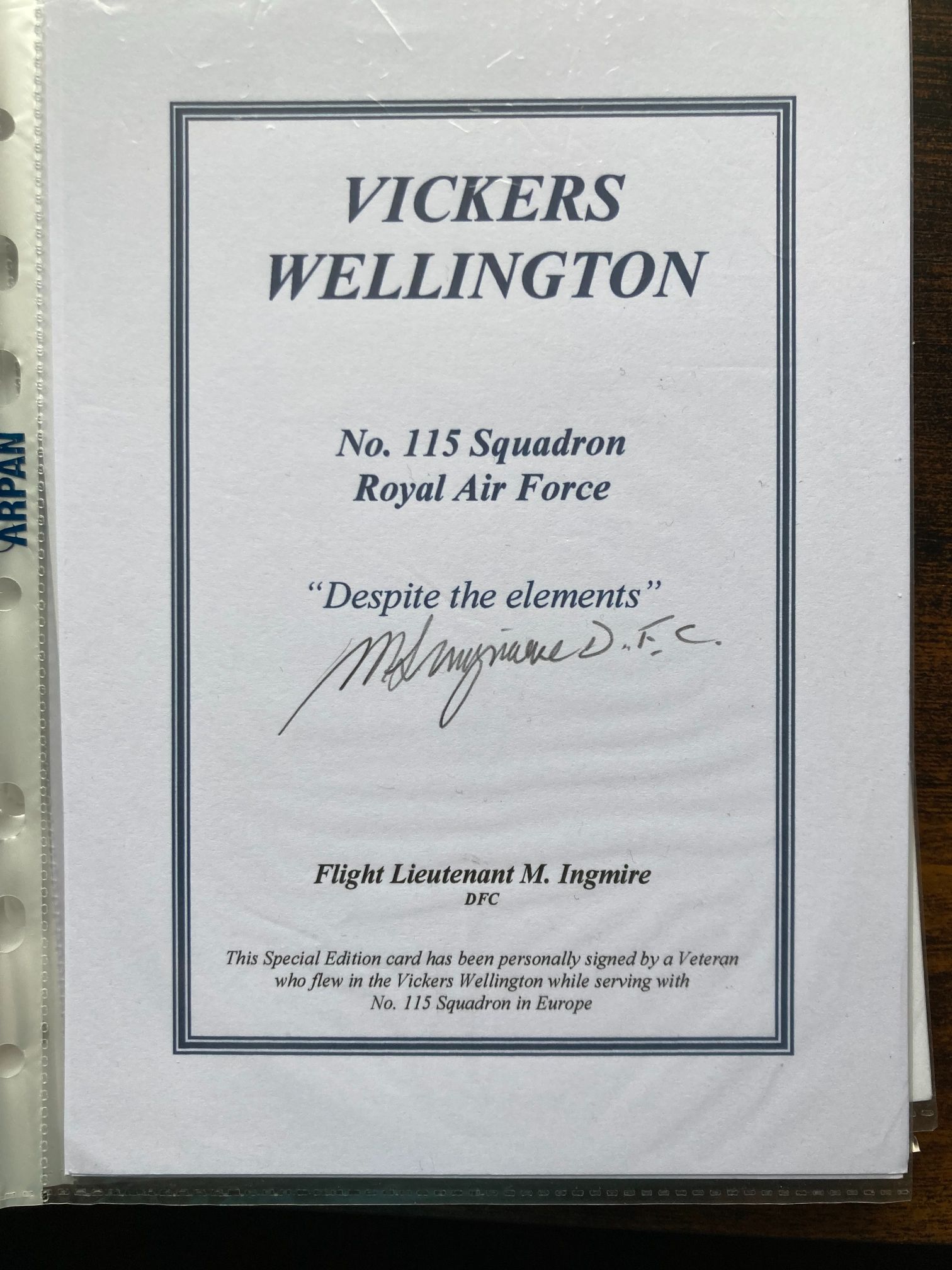 A modern commemorative Special Edition card relating to the Vickers Wellington bomber and No. 115 Squadron, Royal Air Force. The card is hand-signed in black ink by Flight Lieutenant M. Ingmire, DFC. The printed white cardstock features the aircraft name, unit, and the squadron motto, Despite the elements, in blue text within a double-lined border. Below the signature, text confirms Ingmire’s role as a veteran who flew the Vickers Wellington with No. 115 Squadron in Europe during the Second World War. No. 115 Squadron was a significant unit within Bomber Command, and the Distinguished Flying Cross (DFC) indicates a high level of gallantry during active operations against the enemy. This item serves as a legitimate commemorative piece produced for military history enthusiasts and autograph collectors. Dimensions: 210mm x 148mm.
