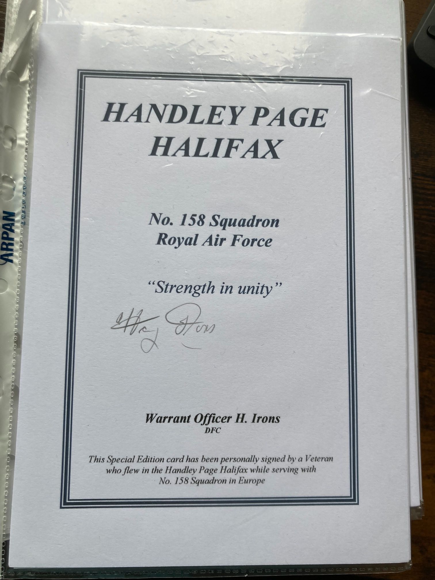 This Royal Air Force special edition commemorative card is dedicated to the Handley Page Halifax heavy bomber and its operational history with No. 158 Squadron. The card is personally hand-signed in black ink by the late Warrant Officer Harry Irons DFC (1924–2021). Serving as a rear gunner, Irons completed two full tours of operations, totalling 60 sorties over occupied Europe, and survived being shot down. No. 158 Squadron was a key Halifax unit based at RAF Lissett during the latter half of the war. The card features the squadron motto Strength in unity and includes a printed confirmation of the signature’s authenticity. Harry Irons was a highly respected veteran and a recipient of the Distinguished Flying Cross, a premier gallantry award for officers and warrant officers of the air forces, recognised for his tireless work for Bomber Command veterans in his later years.