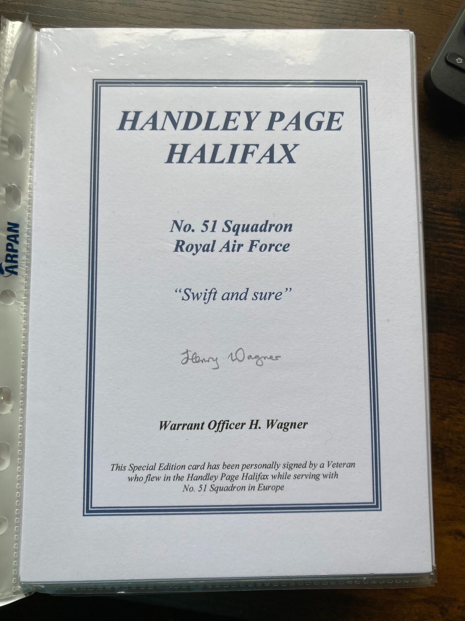This is a modern commemorative Special Edition autographed card or bookplate relating to the Handley Page Halifax heavy bomber and No. 51 Squadron of the Royal Air Force. The squadron, which utilised the Halifax during the Second World War, is identified by its official motto, Swift and sure. The piece is hand-signed in ink by Warrant Officer Henry Wagner, a veteran who served with No. 51 Squadron in the European theatre of operations. Such items were typically produced for historical societies or as commemorative inserts for aviation literature. The printed text serves to authenticate the signature and provides specific provenance regarding the signatorys service. No. 51 Squadron played a significant role within RAF Bomber Command, making signatures from its aircrew of particular interest to aviation historians. Measurements: 210mm x 148mm.