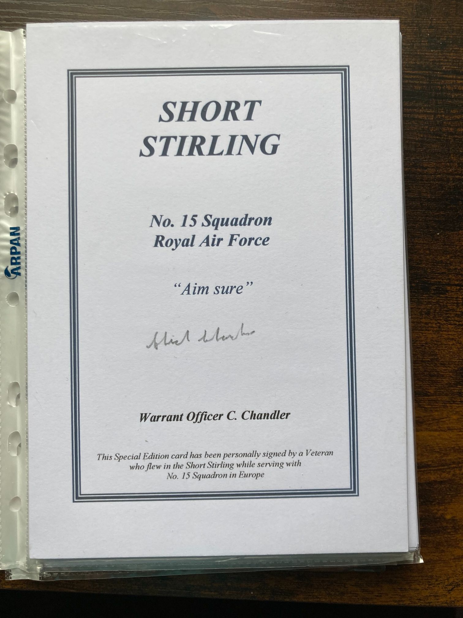 This item is a signed commemorative collector’s card, likely part of a limited edition series produced to honour the legacy of the Royal Air Force during the Second World War. The subject is the Short Stirling, the first British four-engine heavy bomber to see active service. The card specifically commemorates No. 15 Squadron, featuring their official motto, Aim sure. The piece is hand-signed in pencil by Warrant Officer C. Chandler, a veteran airman who operated the Stirling with No. 15 Squadron during missions over Europe. Such ephemera was frequently produced for veterans’ associations or aviation museums during the 1990s and early 2000s to preserve the history of Bomber Command. Text on the card reads: SHORT STIRLING, No. 15 Squadron Royal Air Force, Aim sure, Warrant Officer C. Chandler. This Special Edition card has been personally signed by a Veteran who flew in the Short Stirling while serving with No. 15 Squadron in Europe.