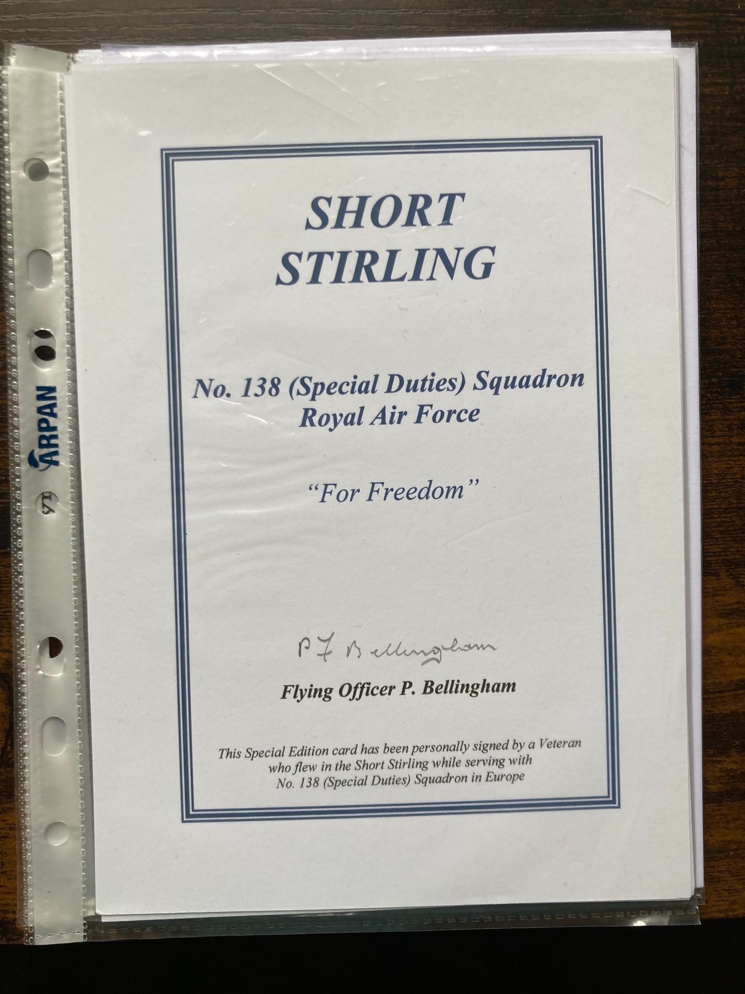 This is a printed commemorative Special Edition card honouring the Short Stirling heavy bomber and its service with No. 138 (Special Duties) Squadron of the Royal Air Force. Produced in the late 20th century as part of a series for aviation enthusiasts and collectors, the card features a hand-signed autograph in black ink by veteran Flying Officer P. Bellingham. No. 138 Squadron held a significant role during the Second World War, operating under the direction of the Special Operations Executive (SOE) to drop secret agents and supplies into occupied territory. The Short Stirling was the RAF’s first four-engine heavy bomber, and though later superseded by the Lancaster and Halifax in main bombing roles, it remained vital for special duties and transport. The card includes the squadron motto For Freedom and a decorative blue double-line border. Transcription: SHORT STIRLING, No. 138 (Special Duties) Squadron, Royal Air Force, For Freedom, Flying Officer P. Bellingham. This Special Edition card has been personally signed by a Veteran who flew in the Short Stirling while serving with No. 138 (Special Duties) Squadron in the European Theatre of Operations. Dimensions: Approximately 148mm x 210mm.