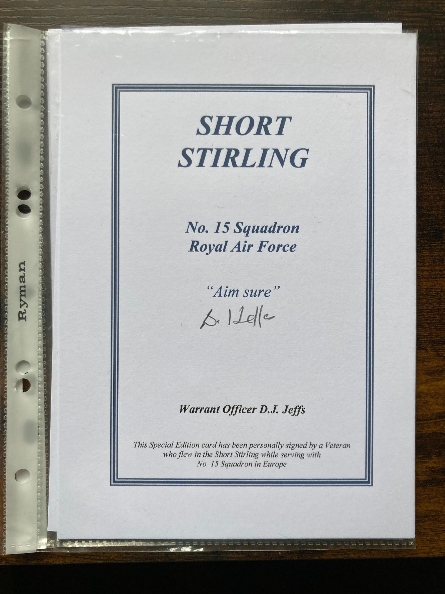 This is a commemorative “Special Edition” signed card celebrating British Second World War aviation history. The card specifically honours the Short Stirling heavy bomber and its service with No. 15 Squadron of the Royal Air Force. The Short Stirling was the first four-engined heavy bomber to enter RAF service, and No. 15 Squadron was one of the primary units to operate the type during the early years of the strategic bombing campaign in Europe. The card features the squadron’s motto, “Aim sure,” and is hand-signed in black ink by Warrant Officer D.J. Jeffs, a veteran who served as aircrew on the Stirling. The text at the bottom confirms the provenance of the signature, stating: “This Special Edition card has been personally signed by a Veteran who flew in the Short Stirling while serving with No. 15 Squadron in Europe.” The layout is clean and formal, typical of late 20th-century commemorative issues produced for collectors and veterans’ associations. The card is printed on heavy white stock with a simple double-line border.