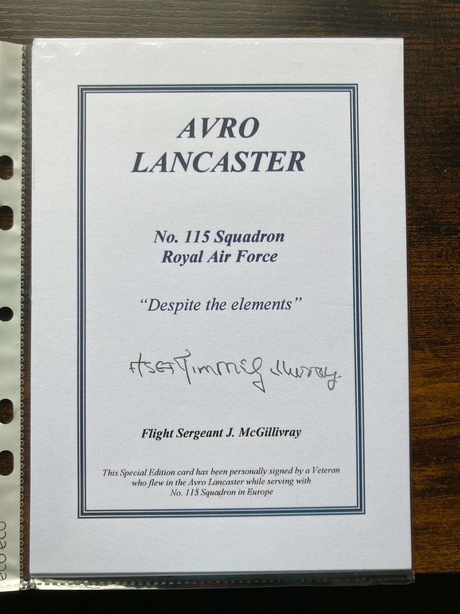 A Royal Air Force (RAF) Bomber Command contemporary commemorative special edition card. The card is dedicated to the Avro Lancaster heavy bomber and specifically honours No. 115 Squadron, featuring the official squadron motto, Despite the elements. The card is personally autographed in black ink by Flight Sergeant J. Jimmy McGillivray, a veteran airman who flew in Avro Lancasters with No. 115 Squadron during the European theatre of operations in the Second World War. No. 115 Squadron was a prominent heavy bomber unit within No. 3 Group, Bomber Command, and played a significant role in the strategic bombing campaign against occupied Europe. This item serves as a personal link to the aircrews who served in the RAF’s most famous heavy bomber.