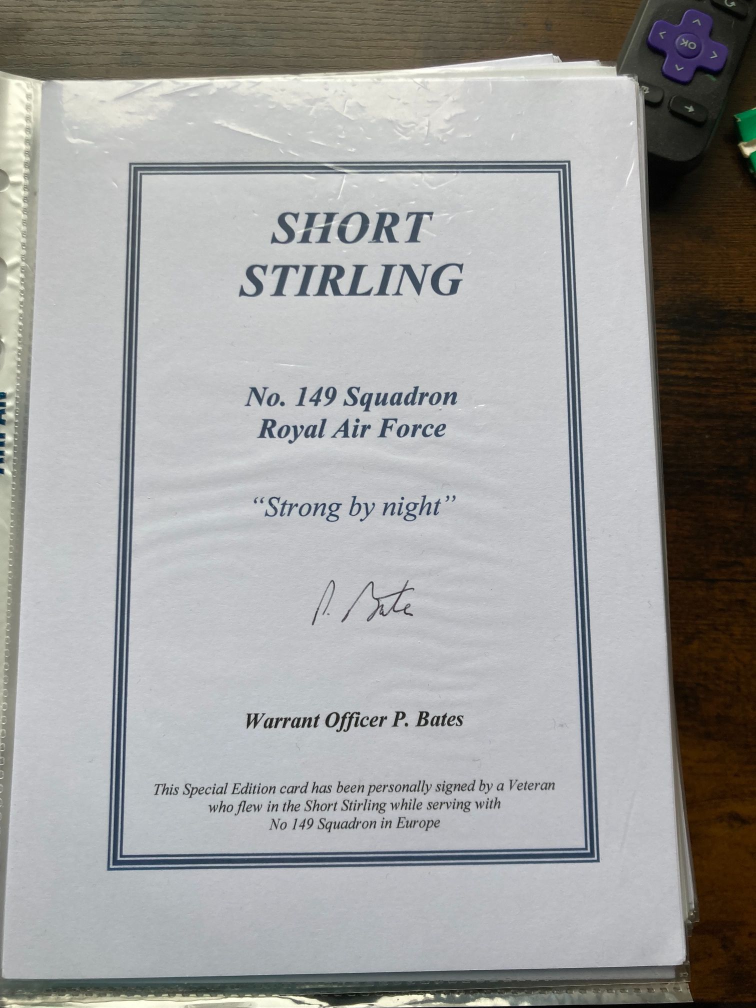 A Royal Air Force Special Edition commemorative document dedicated to the Short Stirling heavy bomber and the history of No. 149 (East India) Squadron. The card is hand-signed in black ink by Warrant Officer P. Bates, a veteran who served as aircrew on Stirling bombers during operations over occupied Europe. No. 149 Squadron holds a significant place in RAF Bomber Command history, having been one of the first units to transition to the four-engined Stirling in November 1940. The document features the squadron’s official motto, Strong by night (Fortis Nocte). This item represents a tangible link to the early heavy bomber offensives of the Second World War, specifically focusing on the Stirling, which was the first of the British four-engine heavies to enter service.