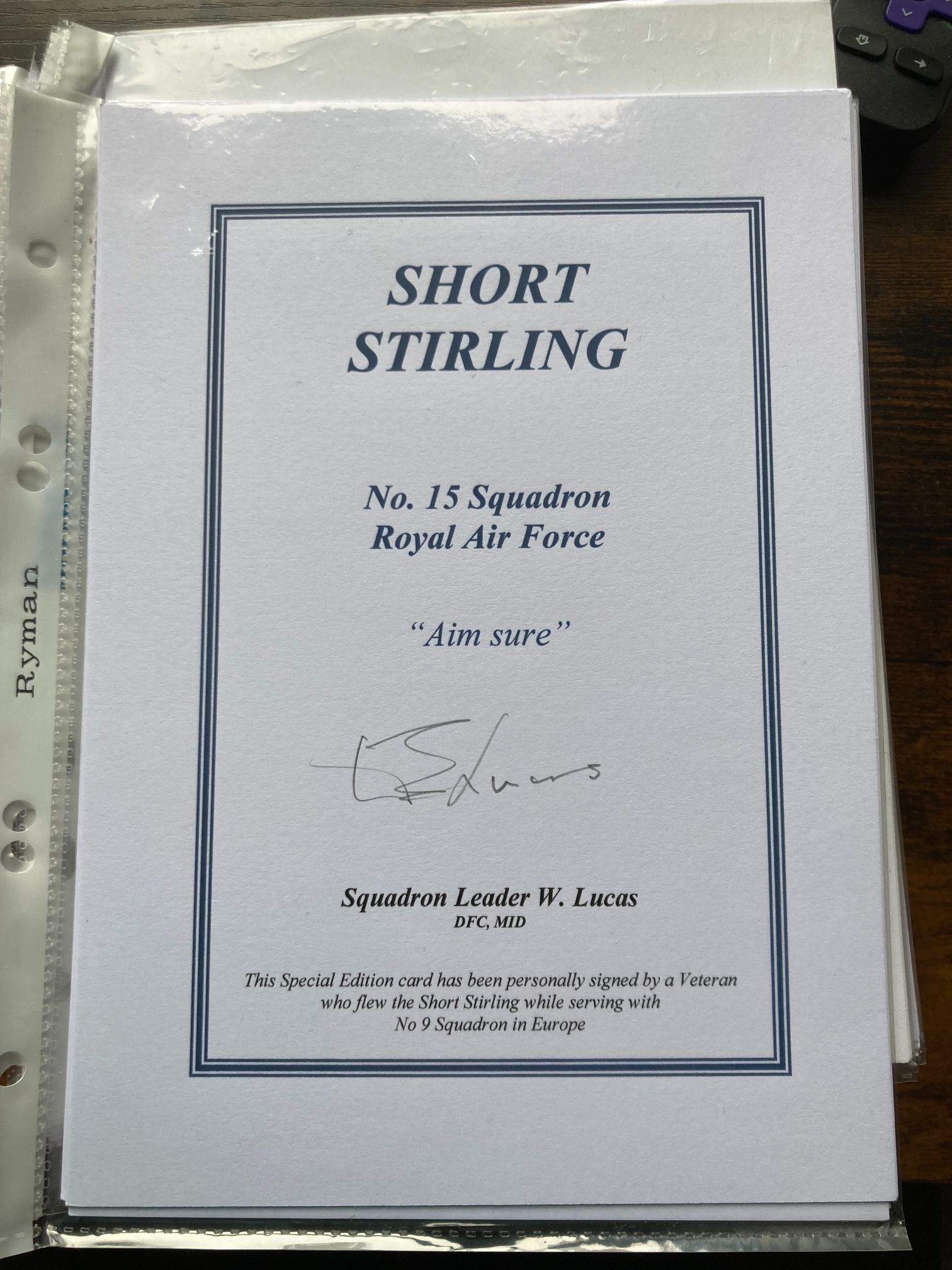 This is a modern commemorative Special Edition signature card produced in the late 20th or early 21st century to honour the service of Royal Air Force veterans of the Second World War. The card is printed on white cardstock with a blue double-rule border and is dedicated to the Short Stirling, which was the first four-engined heavy bomber to enter service with the RAF. The card is hand-signed in black ink by Squadron Leader W. Lucas, a highly decorated pilot who held the Distinguished Flying Cross and was Mentioned in Despatches. There is a notable historical discrepancy on the card; the header references No. 15 Squadron and its motto Aim sure, while the descriptive text at the bottom states that Lucas flew the Stirling while serving with No. 9 Squadron in Europe. Transcribed text: SHORT STIRLING, No. 15 Squadron Royal Air Force, Aim sure, Squadron Leader W. Lucas DFC, MID. This Special Edition card has been personally signed by a Veteran who flew the Short Stirling while serving with No 9 Squadron in Europe. Dimensions: Approximately 148mm x 210mm (A5 size).