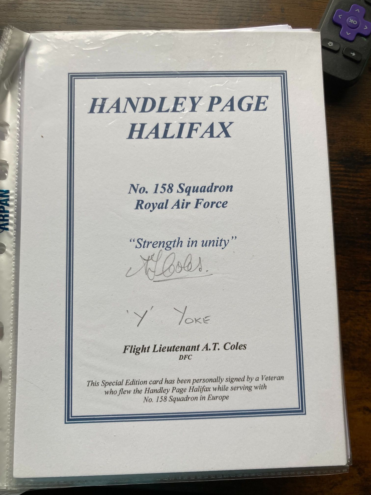 A special edition commemorative card dedicated to the Handley Page Halifax heavy bomber and No. 158 Squadron, Royal Air Force. This squadron was a key component of Bomber Command during the Second World War, famously operating from RAF Lissett. The card features the squadron motto Strength in unity and is hand-signed to the centre by Flight Lieutenant A.T. Coles, DFC. Beneath his signature, the veteran has added a handwritten inscription reading Y YOKE, denoting the individual aircraft identification letter of the Halifax he flew during operational sorties. The Distinguished Flying Cross (DFC) was awarded to officers for acts of valour, courage, or devotion to duty while flying in active operations against the enemy. Items signed by decorated Bomber Command veterans that include specific aircraft provenance are highly regarded by aviation historians and RAF collectors.