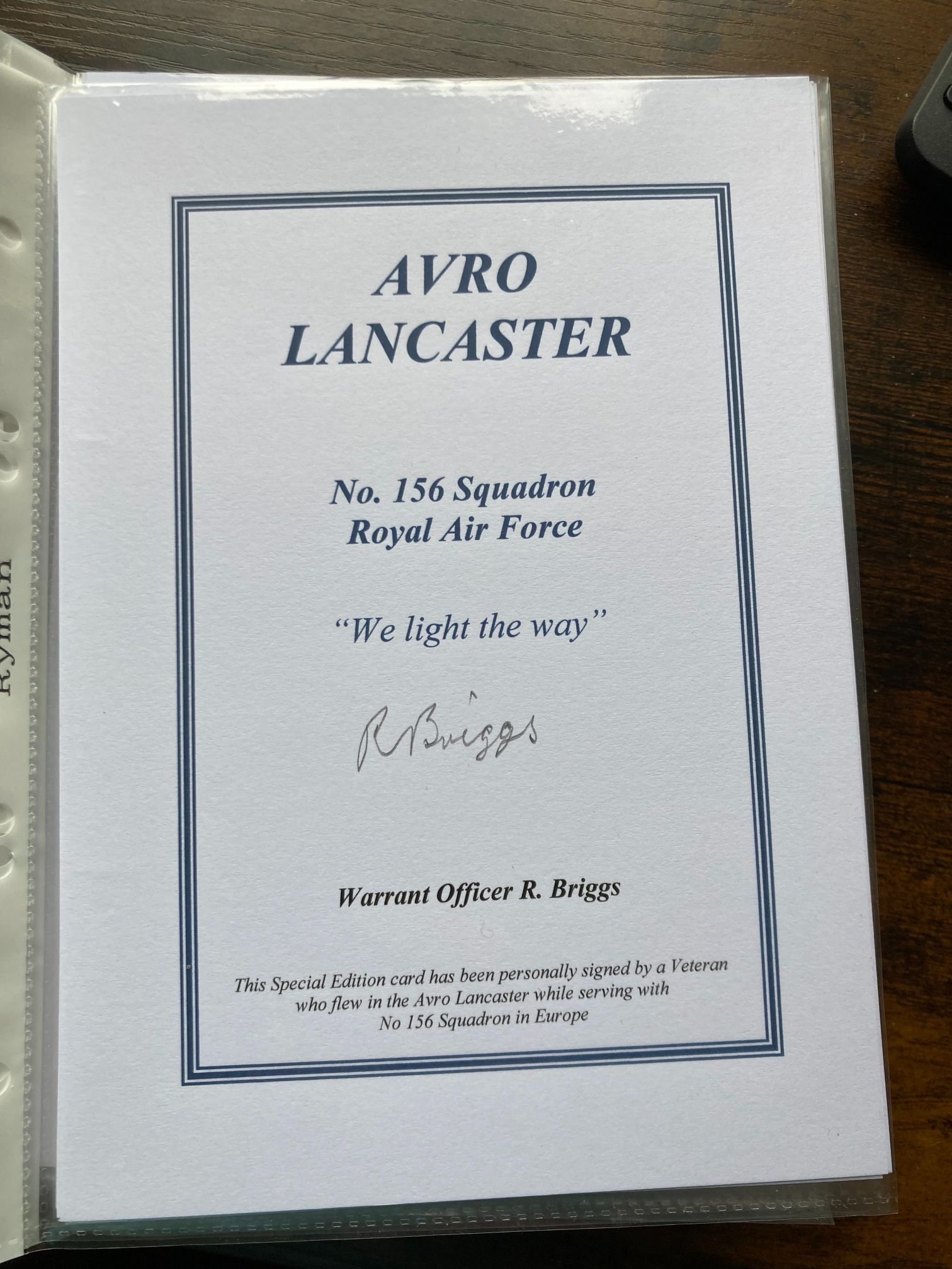A Special Edition commemorative card dedicated to the Avro Lancaster heavy bomber and the personnel of No. 156 Squadron, Royal Air Force. No. 156 Squadron was a key component of the elite Pathfinder Force (PFF) within No. 8 Group, responsible for the hazardous task of navigating to and marking targets for the main bomber stream during the strategic bombing campaign over occupied Europe. The card features the squadron motto, We light the way, and is hand-signed in ballpoint ink by Warrant Officer R. Briggs. Briggs is identified as a veteran aircrew member who flew Lancasters with the squadron during the European theatre of operations. The card is printed on white cardstock with a decorative blue double-border and blue typography. This item represents a tangible link to the specialist crews of Bomber Command and the high-risk operations undertaken by the Pathfinders.