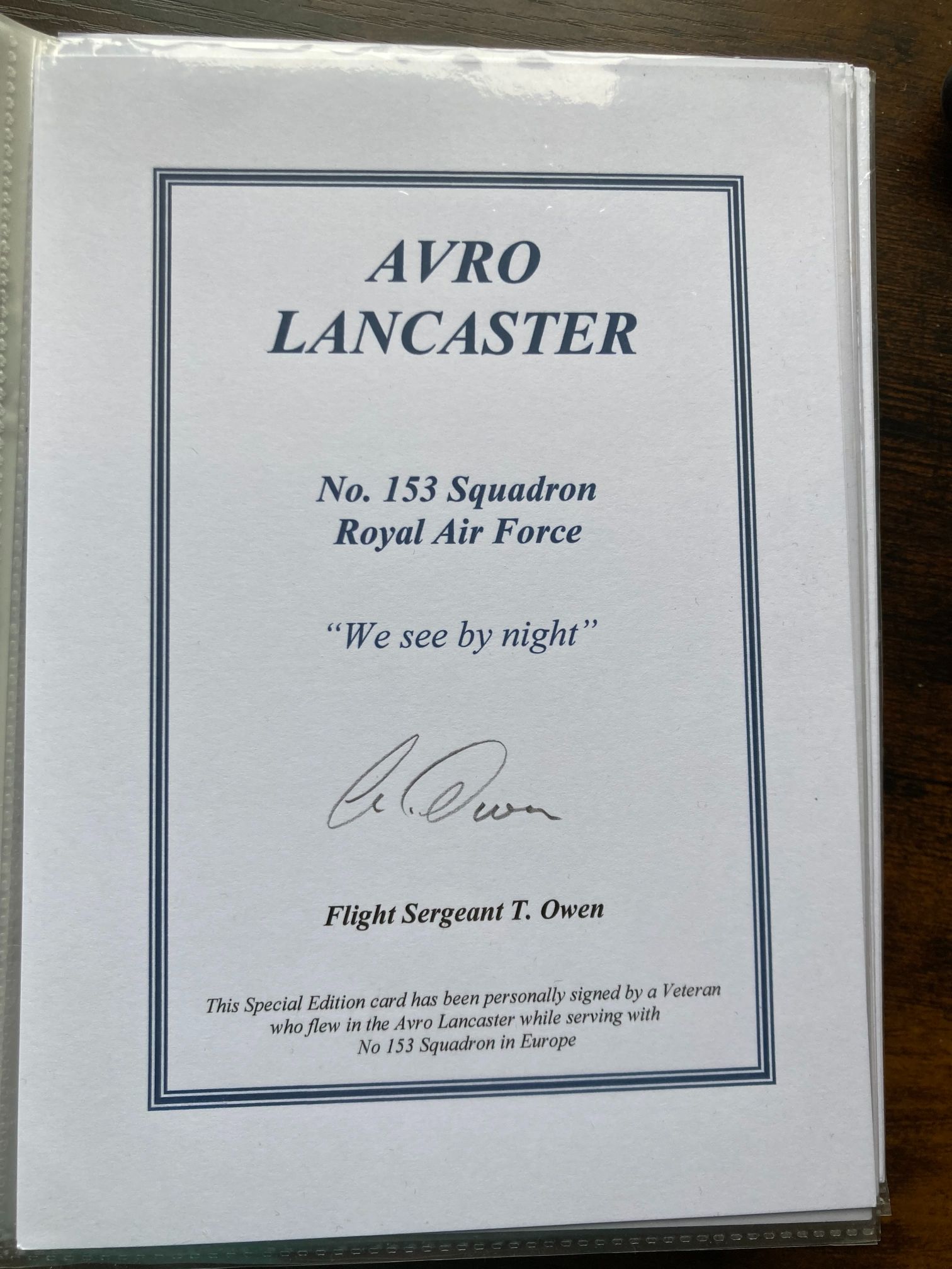 A commemorative Special Edition card dedicated to the Avro Lancaster and the personnel of No. 153 Squadron, Royal Air Force. The card features the squadron’s official motto, We see by night, and is personally hand-signed in ink by veteran Flight Sergeant T. Owen. No. 153 Squadron was a heavy bomber unit within Bomber Command, re-formed in October 1944 at RAF Kirmington before moving to RAF Scampton. Operating the Avro Lancaster, the squadron played a vital role in the final Allied strategic bombing campaign over occupied Europe. Such items are highly regarded by aviation historians and collectors of RAF ephemera, serving as a tangible link to the aircrews who served during the Second World War. Further research into the squadron Operations Record Books (ORBs) may provide additional details regarding Flight Sergeant Owen’s specific sorties and crew position.