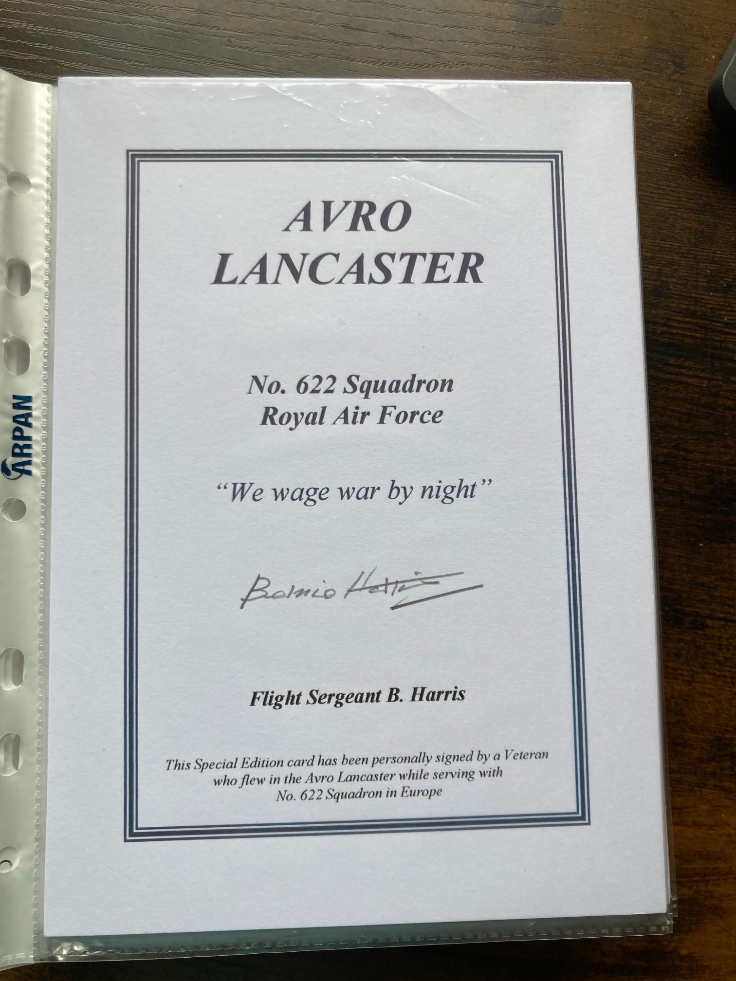 A commemorative Special Edition autograph card dedicated to the Avro Lancaster and No. 622 Squadron, Royal Air Force. The card features the squadron motto, We wage war by night (a translation of the Latin Bellamus Noctu), and is hand-signed in black ink by Flight Sergeant Bernie Harris. Harris was a veteran who served as aircrew on Lancaster heavy bombers with No. 622 Squadron during the strategic bombing campaign in Europe. No. 622 Squadron was established at RAF Mildenhall in August 1943 as part of No. 3 Group, Bomber Command, and remained operational until the end of hostilities in Europe. This item represents an honourable link to the airmen of Bomber Command during the Second World War and is a desirable piece for collectors of Lancaster-related ephemera.