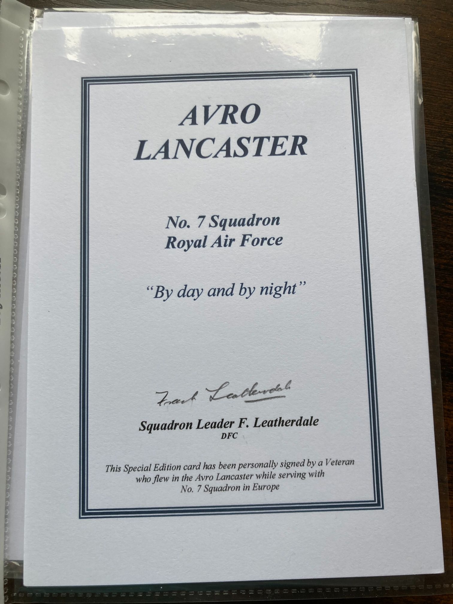A commemorative Special Edition autograph card dedicated to the Avro Lancaster heavy bomber and No. 7 Squadron of the Royal Air Force. The card features a printed double-border design and is hand-signed in black ink by Squadron Leader Frank Leatherdale, DFC (1922-2015). Leatherdale was a distinguished Second World War veteran who served as a navigator with No. 7 Squadron, a key unit within the elite Path Finder Force (PFF). These cards were frequently produced for veteran signing events or as inserts for limited-edition aviation books and prints. Transcription: AVRO LANCASTER; No. 7 Squadron Royal Air Force; By day and by night; Frank Leatherdale (signature); Squadron Leader F. Leatherdale DFC; This Special Edition card has been personally signed by a Veteran who flew in the Avro Lancaster while serving with No. 7 Squadron in Europe. Dimensions: 152mm x 102mm.