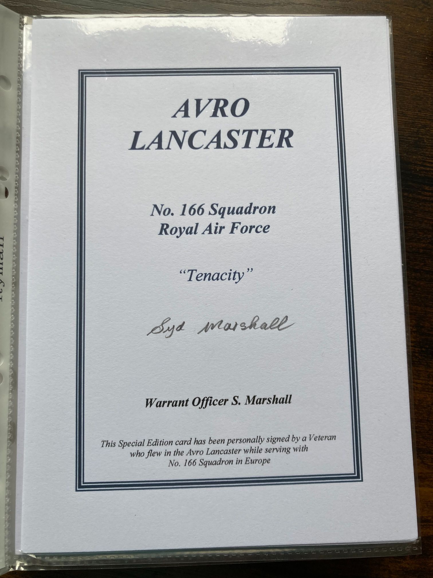 This is a Special Edition commemorative card dedicated to the Avro Lancaster bomber and the service of No. 166 Squadron of the Royal Air Force. The card features the squadron motto, Tenacity, and is hand-signed in the centre by veteran Warrant Officer Syd Marshall (S. Marshall) in pencil. No. 166 Squadron was a significant heavy bomber unit during the Second World War, operating out of RAF Kirmington as part of No. 1 Group Bomber Command. These cards were typically produced in limited numbers for collectors and historical societies during the late 20th or early 21st century to honour the surviving members of Bomber Command. The printed text reads: AVRO LANCASTER, No. 166 Squadron, Royal Air Force, Tenacity, Warrant Officer S. Marshall. A footer note confirms the signature is from a veteran who flew the aircraft in the European theatre. 125mm x 175mm.
