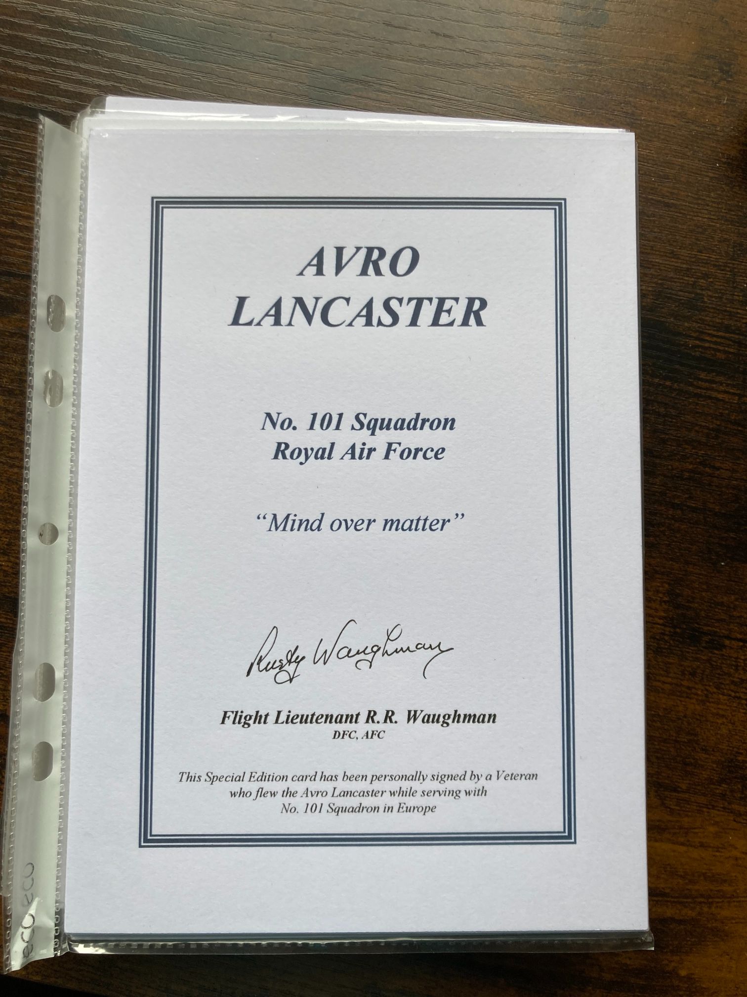 An original Special Edition commemorative card relating to the Avro Lancaster and No. 101 Squadron, Royal Air Force. The card is personally hand-signed in black ink by the notable veteran pilot Flight Lieutenant R.R. Rusty Waughman DFC, AFC. Flight Lieutenant Russell Rusty Waughman (1923–2020) was a distinguished Second World War Lancaster pilot who served with No. 101 Squadron based at RAF Ludford Magna. No. 101 Squadron was a specialised unit within Bomber Command tasked with Airborne Cigar (ABC) radio-jamming operations. These aircraft carried an extra crew member to operate equipment designed to disrupt German night-fighter communications, a high-risk role that made the squadron’s Lancasters primary targets for the Luftwaffe. The card features the squadron’s motto Mind over matter (a translation of Mens Agitat Molem) and the printed name and gallantry awards of the signatory. Waughman’s DFC (Distinguished Flying Cross) and AFC (Air Force Cross) signify a career of exceptional bravery and skill. This item represents a significant piece of RAF Bomber Command ephemera.