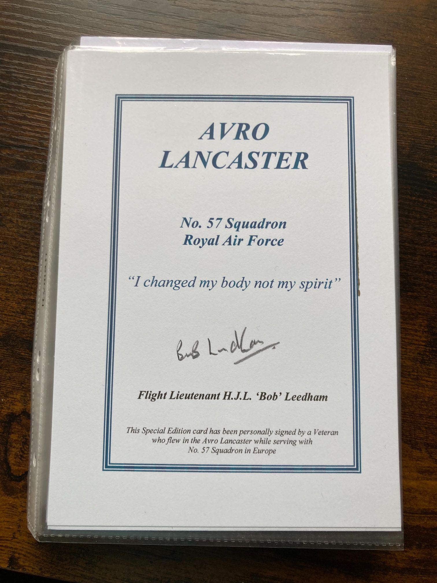 A commemorative Special Edition card dedicated to the Avro Lancaster heavy bomber and No. 57 Squadron, Royal Air Force. The card is personally hand-signed in black ink by Flight Lieutenant H.J.L. Bob Leedham, a veteran who flew Lancasters with No. 57 Squadron during the strategic bombing campaign over Europe. No. 57 Squadron was a prominent heavy bomber unit within No. 5 Group, Bomber Command, operating from notable bases such as RAF Scampton and RAF East Kirkby. The card prominently features the squadron motto, Corpus non animum muto (I changed my body not my spirit). Such items serve as important historical links to the aircrews of Bomber Command and are highly regarded by aviation enthusiasts and collectors of RAF militaria.