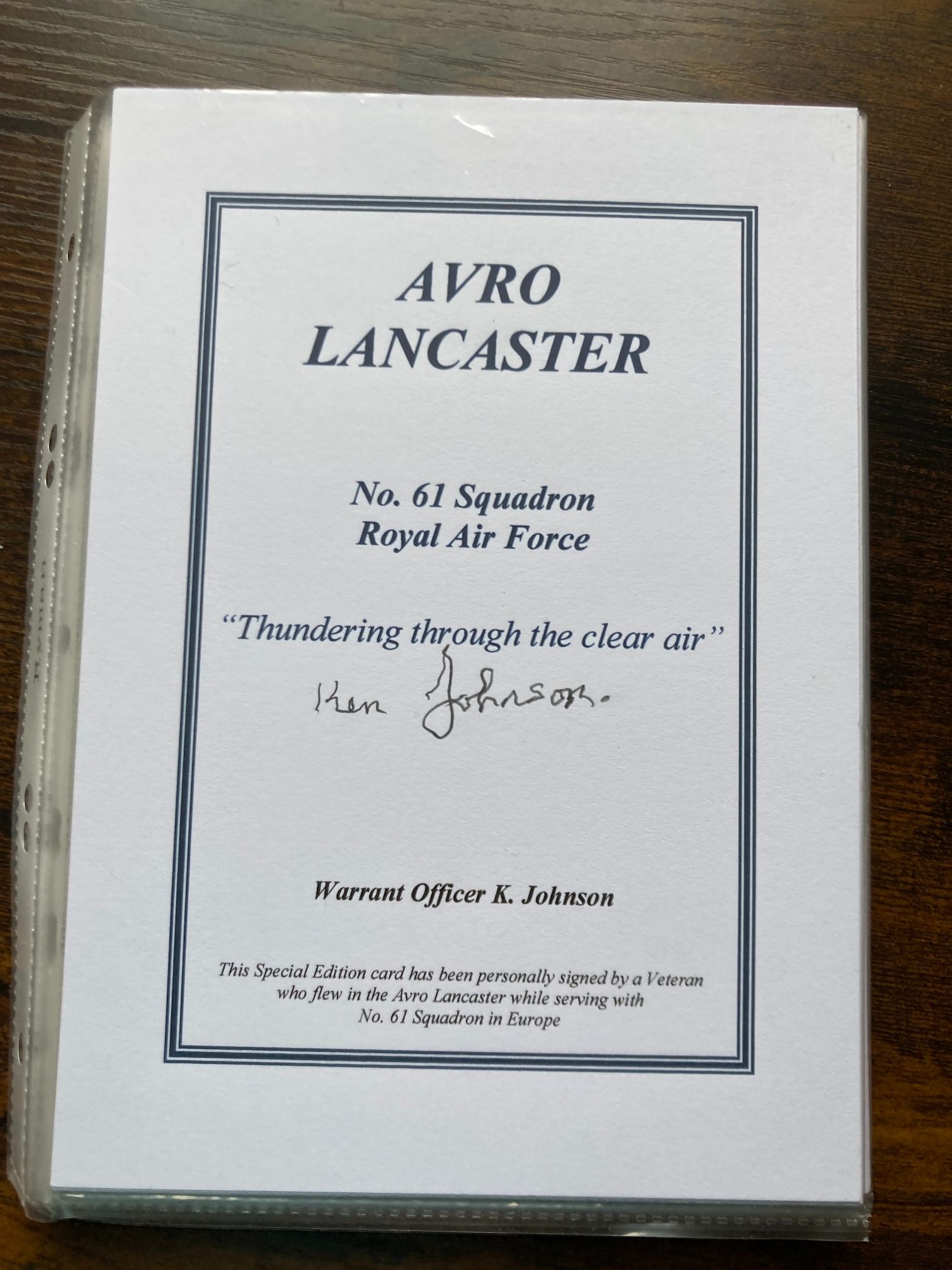 This item is a modern commemorative special edition signature card honouring the Avro Lancaster and the personnel of No. 61 Squadron, Royal Air Force. The card is hand-signed in black ink by veteran Warrant Officer Ken Johnson. No. 61 Squadron was a distinguished heavy bomber squadron that played a significant role in the Allied air campaign over occupied Europe during the Second World War, notably operating out of RAF Skellingthorpe. This type of ephemera was produced for the aviation collectables market to document the first-hand signatures of surviving aircrew. The card is printed with the following text: AVRO LANCASTER, No. 61 Squadron, Royal Air Force, Thundering through the clear air, Ken Johnson, Warrant Officer K. Johnson. It further notes: This Special Edition card has been personally signed by a Veteran who flew in the Avro Lancaster while serving with No. 61 Squadron in Europe. Dimensions: 148mm x 105mm.