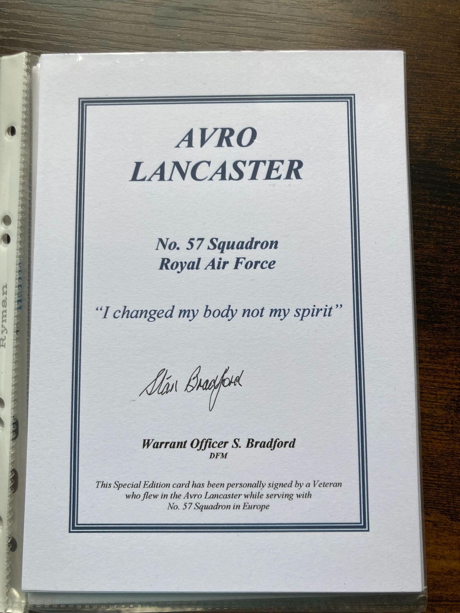 This is a modern commemorative Special Edition ephemera card produced to honour the history of the Avro Lancaster and the service of No. 57 Squadron, Royal Air Force. The card is hand-signed in black ink by Warrant Officer Stan Bradford, DFM. Bradford was a distinguished mid-upper gunner during the Second World War, credited with several aerial victories while flying with Bomber Command. The card features the translated squadron motto: I changed my body not my spirit. The printed text includes: AVRO LANCASTER, No. 57 Squadron Royal Air Force, I changed my body not my spirit, and Warrant Officer S. Bradford DFM. A statement at the bottom reads: This Special Edition card has been personally signed by a Veteran who flew in the Avro Lancaster while serving with No. 57 Squadron in Europe. This item serves as a significant piece of aviation memorabilia, connecting collectors to the history of the RAF Lancaster crews.