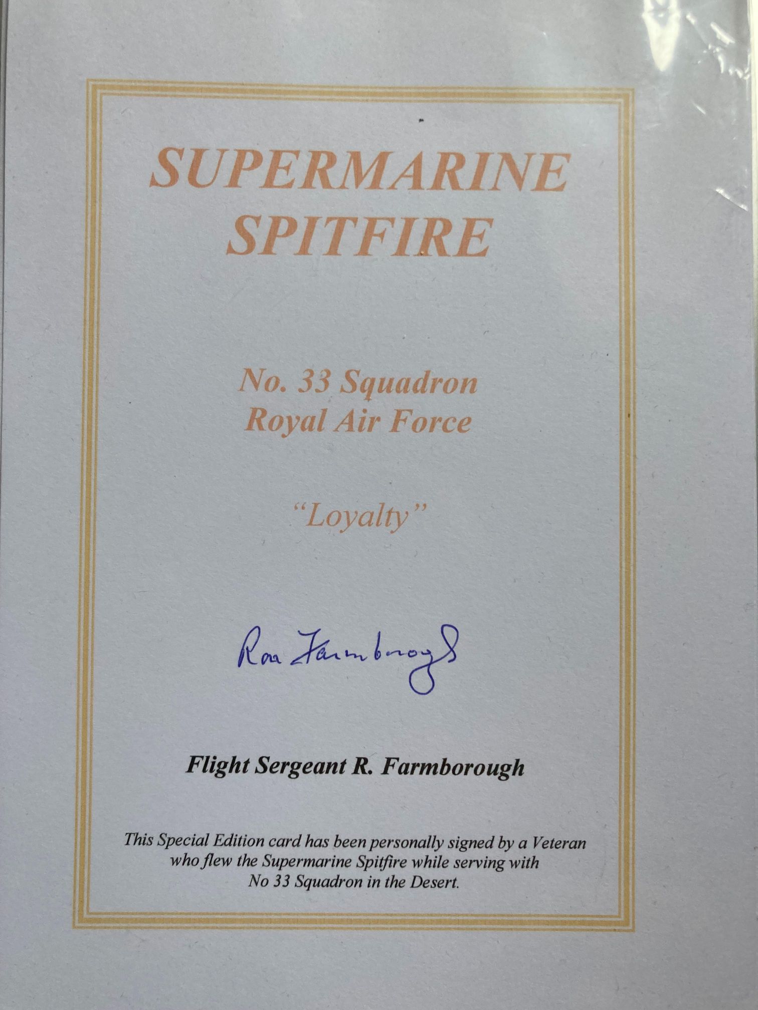 This lot features a Special Edition Royal Air Force commemorative card bearing the original autograph of Flight Sergeant Ron Farmborough. The card is dedicated to the Supermarine Spitfire and No. 33 Squadron, featuring the squadron motto Loyalty. Flight Sergeant Farmborough was a veteran pilot who flew Spitfires with No. 33 Squadron during the North African Desert campaign. Historically, No. 33 Squadron served with distinction in the Western Desert, converting from Hawker Hurricanes to Supermarine Spitfire Mk Vcs in early 1943 to provide vital air cover for the Eighth Army. The card is boldly signed Ron Farmborough in blue ink to the centre. This item represents a tangible link to the operations of the Desert Air Force during the Second World War.