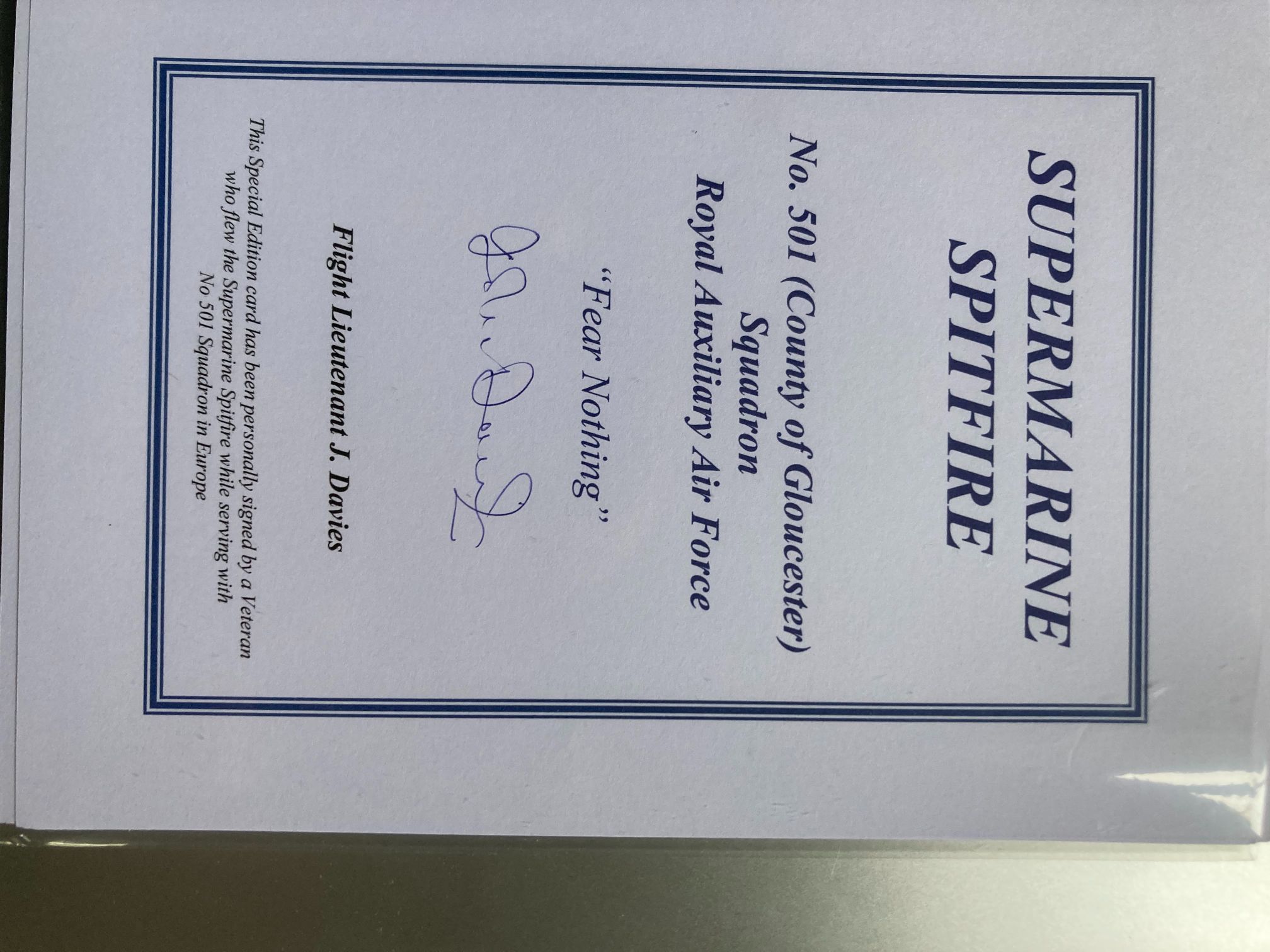 This is a commemorative signed insert card, issued circa 2000 as part of the Matchbox Collectibles Platinum Edition WWII series. The piece honours the Supermarine Spitfire and the No. 501 (County of Gloucester) Squadron of the Royal Auxiliary Air Force. Historically, No. 501 Squadron was a highly distinguished unit that played a vital role during the Battle of Britain and the subsequent liberation of Europe. The card features a hand-signed signature in blue ink by Flight Lieutenant J. Davies, a veteran pilot who flew the Spitfire with the squadron. The transcribed text includes: SUPERMARINE SPITFIRE; No. 501 (County of Gloucester) Squadron Royal Auxiliary Air Force; Fear Nothing; Flight Lieutenant J. Davies; This Special Edition card has been personally signed by a Veteran who flew the Supermarine Spitfire while serving with No 501 Squadron in Europe. 152mm x 102mm.
