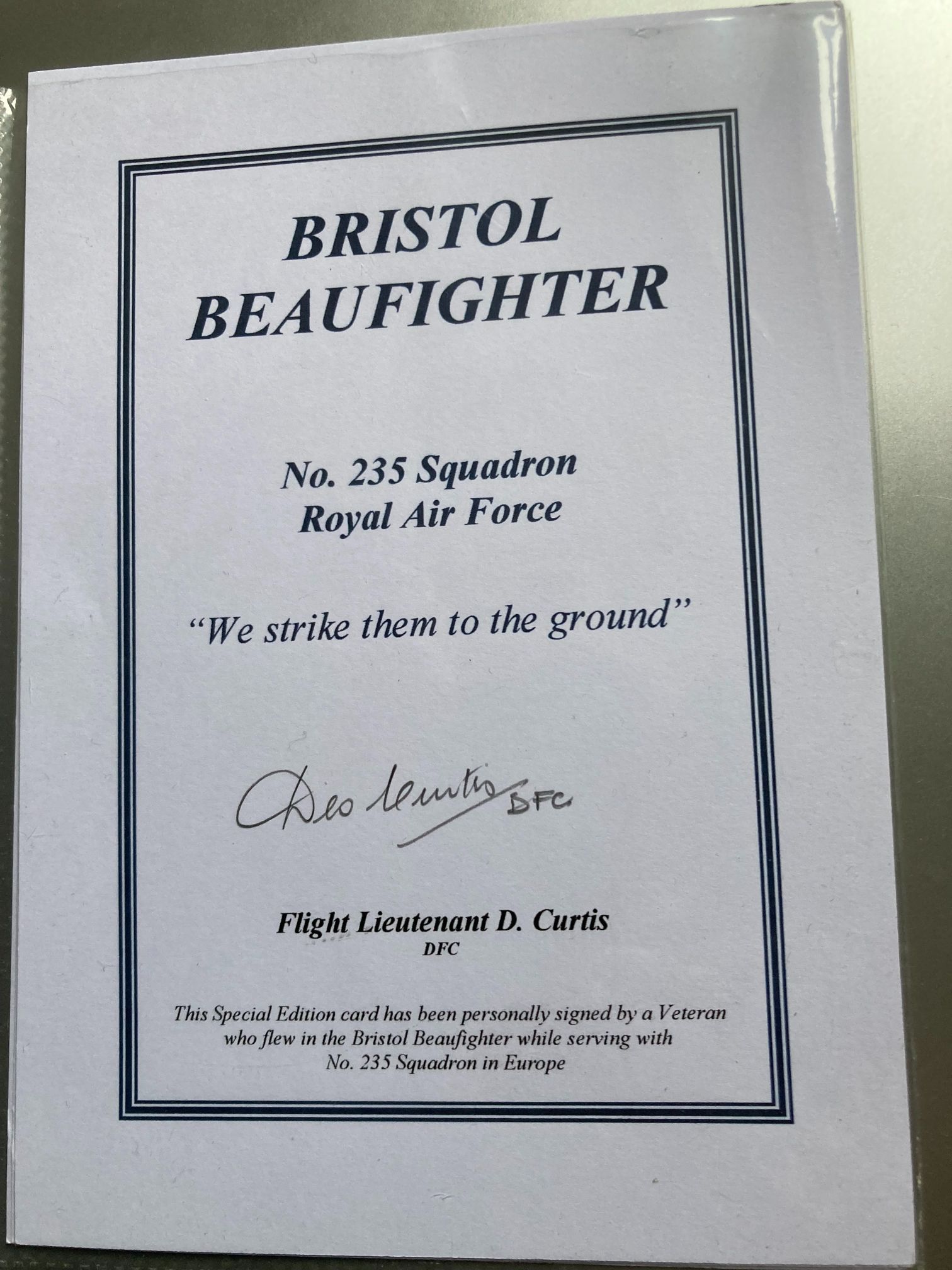A special edition commemorative card dedicated to the Bristol Beaufighter strike aircraft, personally hand-signed in black ink by Flight Lieutenant Des Curtis, DFC. The card features the insignia of No. 235 Squadron, Royal Air Force, including the official squadron motto, “We strike them to the ground.” Des Curtis was a highly distinguished navigator and wireless operator within RAF Coastal Command. During his service with No. 235 Squadron, he participated in hazardous low-level anti-shipping strikes against German convoys in the European theatre of operations. He is perhaps most famously recognised for his subsequent role in the “Tsetse” Mosquito operations with No. 248 Squadron, where he flew missions using the 57mm Molins gun against U-boats. His Distinguished Flying Cross (DFC) was awarded for his gallantry and devotion to duty during these intensive operations. This item serves as a significant piece of aviation ephemera, linking directly to one of Coastal Command’s most celebrated veterans.