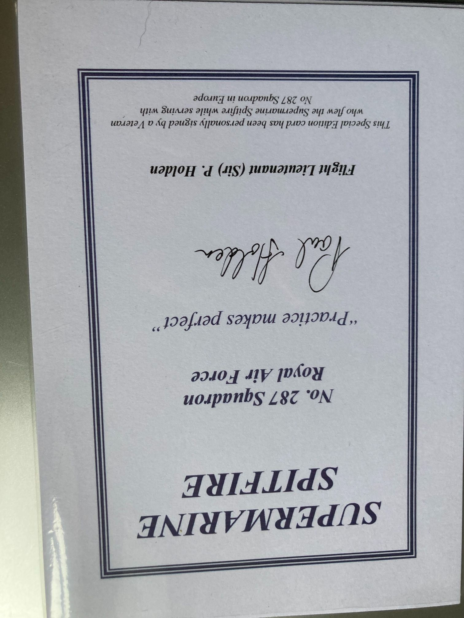 This item is a modern Special Edition commemorative card produced in the late 20th or early 21st century to honour the service of Royal Air Force veterans. The card is dedicated to the Supermarine Spitfire and No. 287 Squadron. It features the original hand-signed signature of Flight Lieutenant (Sir) Paul Holden in black ink at the centre. No. 287 Squadron was an anti-aircraft cooperation unit, and Holden is recognised here as a veteran who flew the Spitfire during European operations. The card is printed with dark blue text and a matching double-line border on bright white cardstock. Transcribed text includes: SUPERMARINE SPITFIRE, No. 287 Squadron Royal Air Force, Practice makes perfect, and Flight Lieutenant (Sir) P. Holden. A printed authentication statement at the base confirms the signature was provided by a veteran who flew the Supermarine Spitfire while serving with No 287 Squadron in Europe.