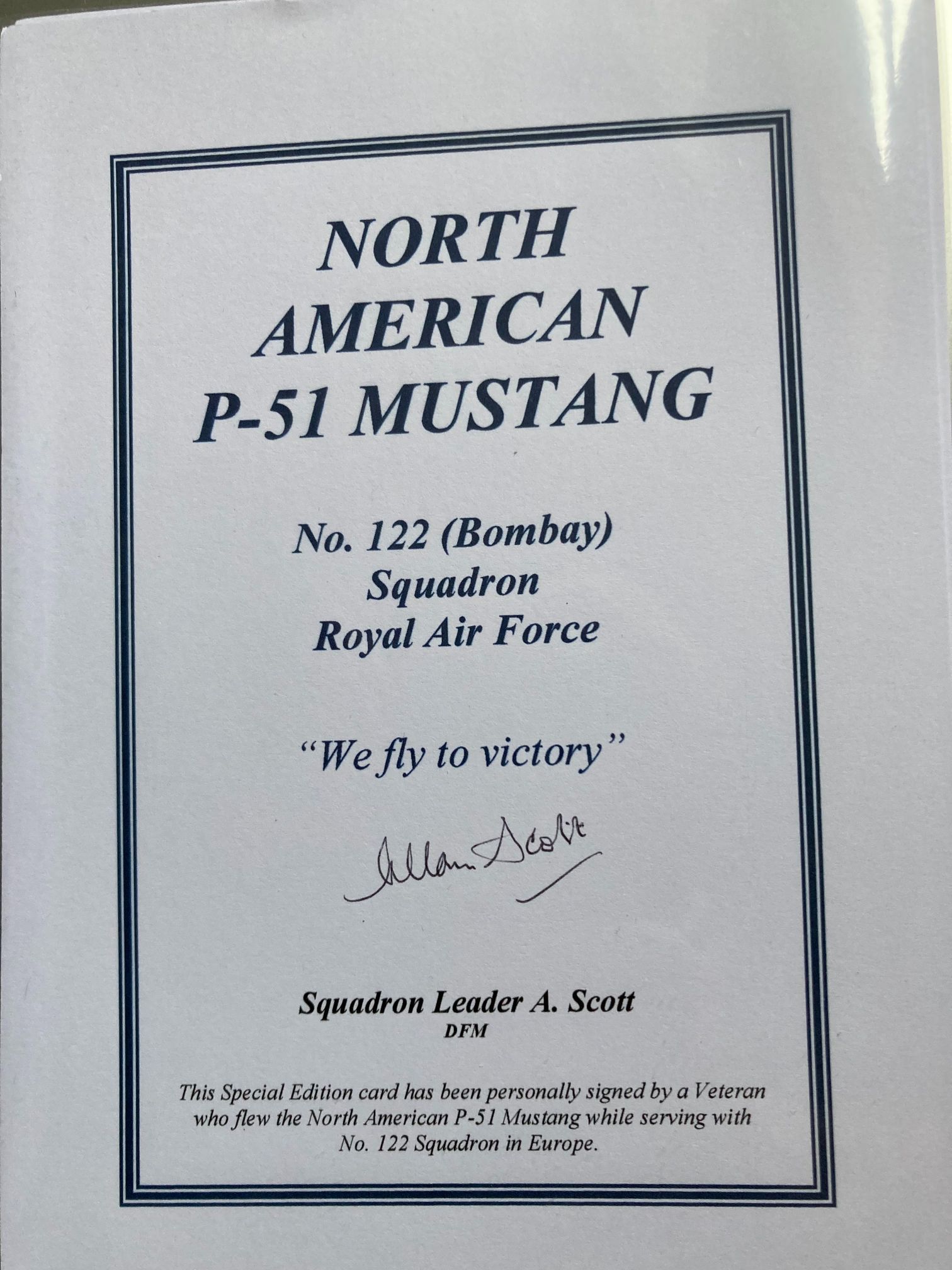 This is a special edition commemorative card hand-signed in black ink by Squadron Leader Allan Scott, DFM. The card is printed on heavy white cardstock and features a decorative blue double-line border. The subject matter focuses on the North American P-51 Mustang aircraft and its operational history with No. 122 (Bombay) Squadron of the Royal Air Force. Allan Scott was a highly distinguished Second World War fighter pilot and ace, famously credited with multiple aerial victories during the Siege of Malta before later serving in the European Theatre of Operations flying Mustangs. The card includes the squadron motto, We fly to victory. Transcription of printed text: NORTH AMERICAN P-51 MUSTANG, No. 122 (Bombay) Squadron Royal Air Force, We fly to victory, Squadron Leader A. Scott DFM. A printed explanatory note at the bottom confirms: This Special Edition card has been personally signed by a Veteran who flew the North American P-51 Mustang while serving with No. 122 Squadron in Europe. This item is a significant piece of aviation ephemera, likely produced as part of a limited commemorative series for the collectors’ market in the late 20th century.