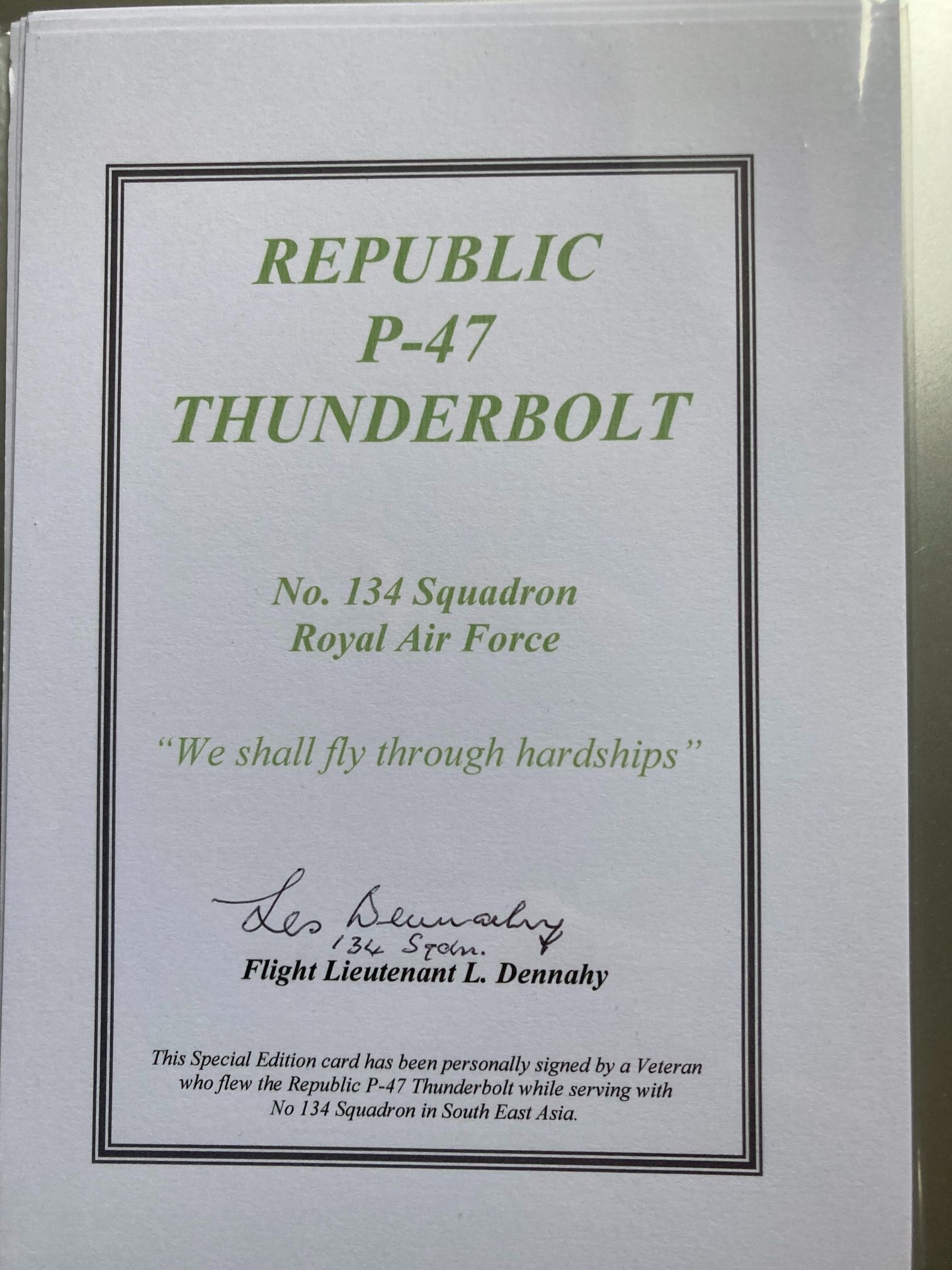 A Special Edition commemorative autographed card honouring the Republic P-47 Thunderbolt and its service with the Royal Air Force No. 134 Squadron during the Second World War. The card features a double-bordered frame with green-printed text, including the squadron motto: We shall fly through hardships. It is hand-signed in black ink by Flight Lieutenant Les Dennahy, a veteran pilot who served with the unit in the South East Asia Command (SEAC). Below the signature, Dennahy has added his unit designation, 134 Sqdn. The lower portion of the card contains an explanatory text confirming the provenance of the signature. No. 134 Squadron was notably active in the Burma Campaign, utilising the Thunderbolt in ground-attack roles. These cards were typically produced as limited edition inserts for aviation art or specialised historical publications. Transcription: REPUBLIC P-47 THUNDERBOLT; No. 134 Squadron Royal Air Force; We shall fly through hardships; Les Dennahy 134 Sqdn.; Flight Lieutenant L. Dennahy; This Special Edition card has been personally signed by a Veteran who flew the Republic P-47 Thunderbolt while serving with No 134 Squadron in South East Asia.