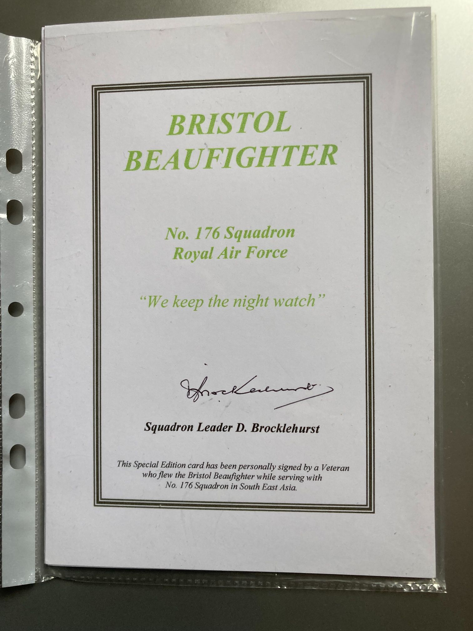 A Special Edition commemorative card dedicated to the Bristol Beaufighter aircraft and its operational history with No. 176 Squadron, Royal Air Force. This unit was a specialist night-fighter squadron re-formed in India during January 1943 to provide night defence for Calcutta and other strategic locations within the South East Asia Command (SEAC). The card is personally signed in black ink by Squadron Leader D. Brocklehurst, a veteran pilot who flew Beaufighters with the squadron during the Burma campaign. The card features the squadron motto, We keep the night watch, and includes printed text verifying the signatory’s service history. Such ephemera provides a tangible link to the specialist radar-equipped night-fighter operations conducted against Japanese air raids in the Far East.