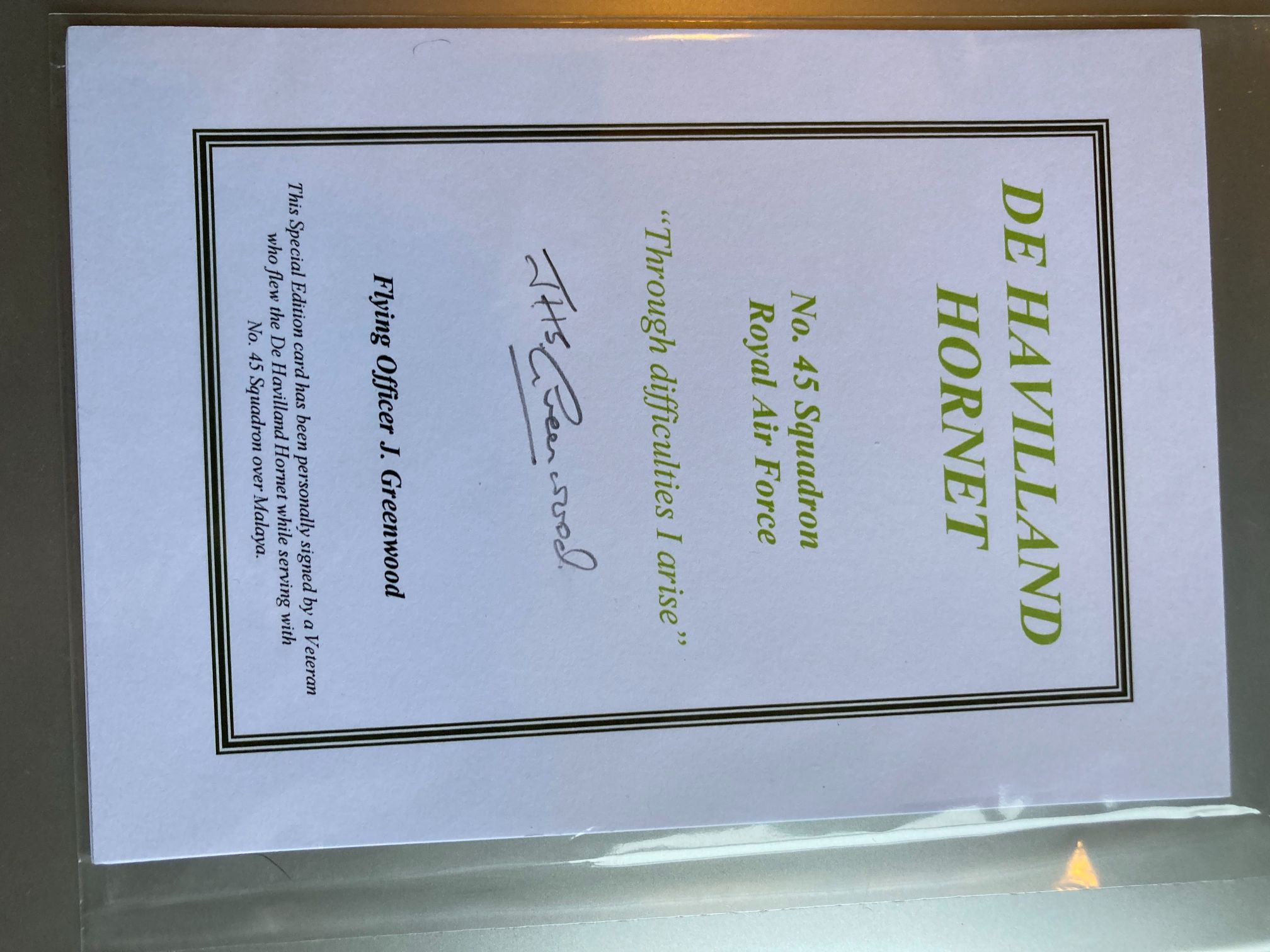 A special edition commemorative collector’s card produced in the late 20th century to honour the De Havilland Hornet and its service with No. 45 Squadron of the Royal Air Force. The card features the squadron motto, Through difficulties I arise, and is hand-signed in black ink by Flying Officer J. Greenwood. This item holds historical significance as it commemorates the pilots who flew during the Malayan Emergency (1950-1955), a period when the Hornet was utilised for ground-attack operations in Southeast Asia. Transcribed text: DE HAVILLAND HORNET, No. 45 Squadron, Royal Air Force, Through difficulties I arise, Flying Officer J. Greenwood. This Special Edition card has been personally signed by a Veteran who flew the De Havilland Hornet while serving with No. 45 Squadron over Malaya. Dimensions: 150mm x 105mm.