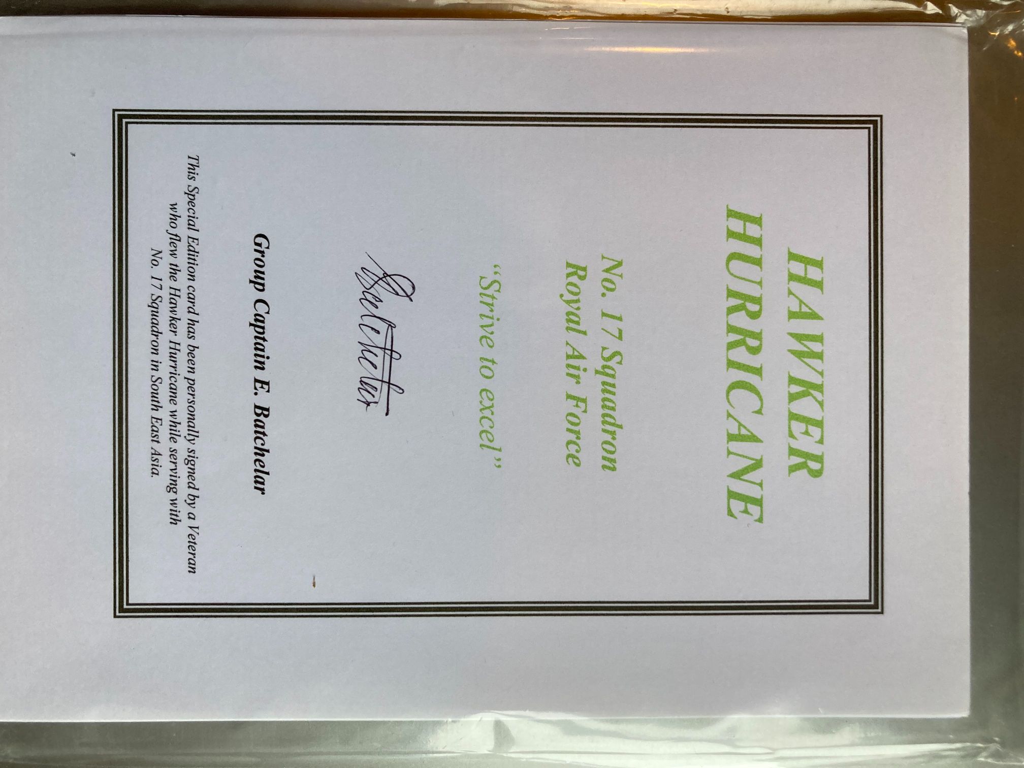 This is a printed commemorative card or insert produced as a special edition for aviation enthusiasts and collectors, honouring the Hawker Hurricane aircraft and its operational history with No. 17 Squadron of the Royal Air Force. The card is hand-signed in bold black ink by Group Captain Eric Batchelar, a noted RAF veteran who served with the squadron in the South East Asia theatre during the Second World War, specifically during the Burma campaign. The card features a formal layout with a double-line black border and text printed in green and black. The squadron motto, “Strive to excel,” is positioned at the centre. Transcribed text includes: HAWKER HURRICANE, No. 17 Squadron Royal Air Force, “Strive to excel”, Group Captain E. Batchelar. A descriptive block at the bottom left confirms the provenance of the signature: “This Special Edition card has been personally signed by a Veteran who flew the Hawker Hurricane while serving with No. 17 Squadron in South East Asia.” These cards were often issued as limited edition accompaniments to aviation literature or commemorative sets in the late 20th century.