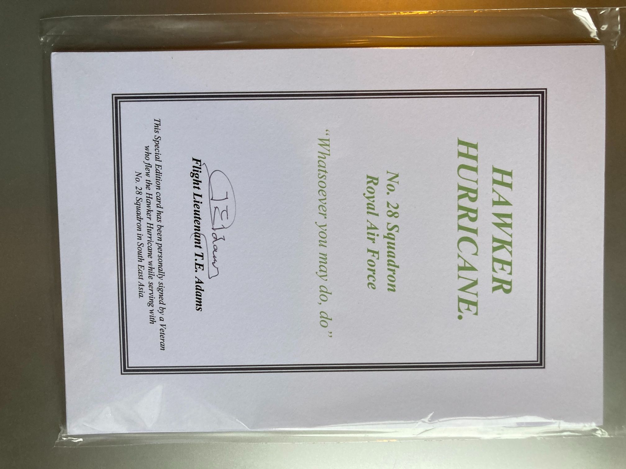 A professionally printed special edition commemorative card honouring the Hawker Hurricane and its operational history with No. 28 Squadron, Royal Air Force. The card is hand-signed in black ink by Flight Lieutenant T.E. Adams. The printed text confirms that the card was personally signed by a veteran who flew the Hawker Hurricane while serving with No. 28 Squadron in South East Asia. During the Second World War, No. 28 Squadron was a distinguished unit within the South East Asia Command (SEAC), operating primarily in the Burma campaign. The squadron was tasked with vital tactical reconnaissance and ground-attack missions, often flying at low altitudes to support the 14th Army. The card features the squadron’s official motto, Whatsoever you may do, do, and is finished with green typeface. This item serves as a significant piece of RAF ephemera relating to the often-overlooked Forgotten Army campaign in the Far East.