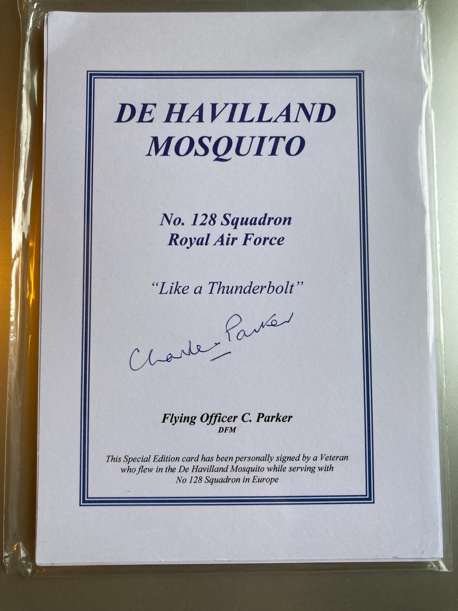 A commemorative Special Edition card dedicated to the De Havilland Mosquito and its operational history with No. 128 Squadron of the Royal Air Force during the Second World War. This historical document is hand-signed in blue ink by Flying Officer Charles Parker, DFM. No. 128 Squadron was a vital component of the Light Night Striking Force within RAF Bomber Command, utilising the Mosquito’s exceptional speed and wooden construction for precision bombing raids and pathfinder duties over occupied Europe. The card features the squadron’s heraldic motto, Like a Thunderbolt, and identifies the signatory with his commissioned rank and his Distinguished Flying Medal (DFM), an honour awarded for exceptional valour and devotion to duty during active flight operations. The printed text serves as a contemporary certificate of authenticity, verifying the signature was provided by the veteran. This item represents a significant piece of aviation history, linking the iconic Wooden Wonder aircraft to the personnel who flew it in combat. Measurements: 148mm x 210mm.
